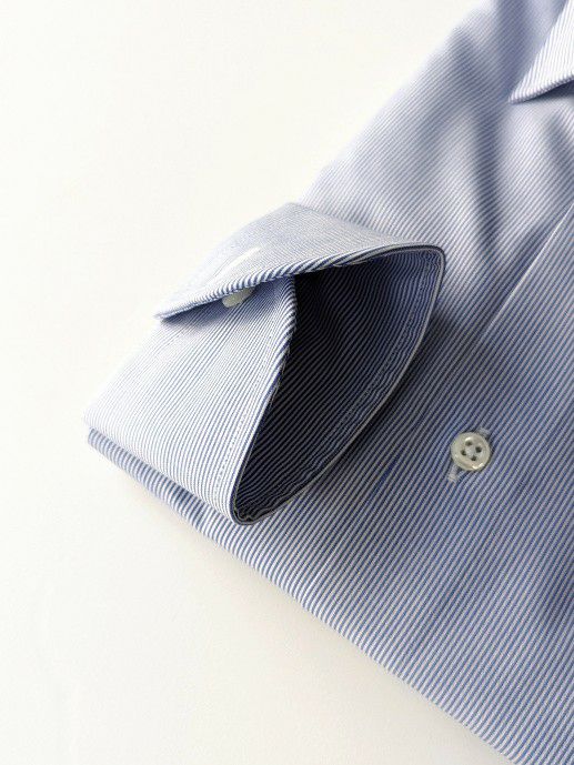 ヘアラインストライプの定番ドレスシャツになります。主張しすぎないブルーが柔らかな印象の一着。また、セミワイドカラーが美しく、エレガントなタイドアップが叶います。
