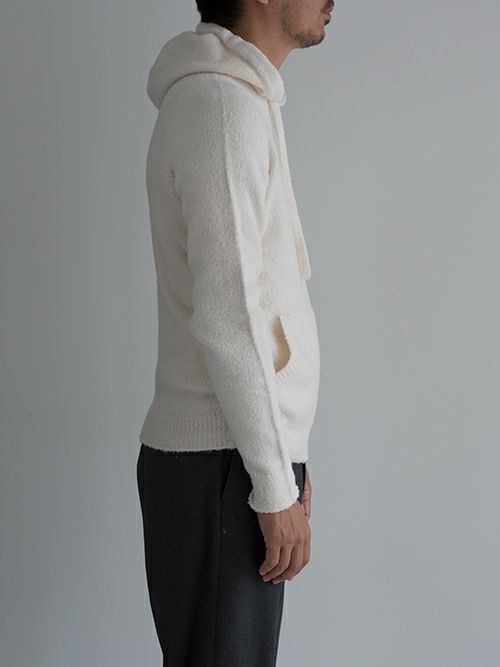 コットンナイロン混のニットパーカ。比較的すっきりとしたシルエットで、アームも細身です。アウターの中でもゴワつかず、インナー使いにも最適な一着。