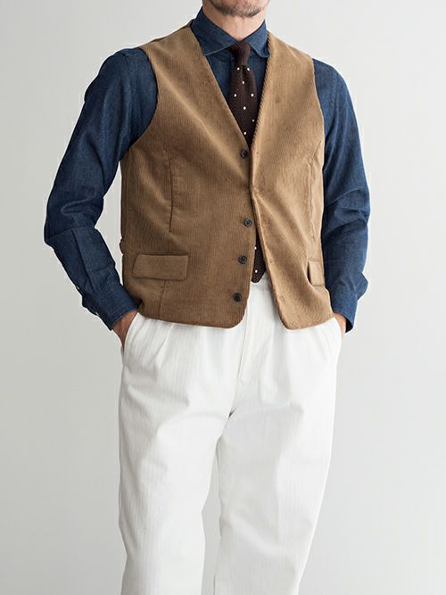 ドレスとワークの雰囲気が合わさり、固有の存在感を見せるコーデュロイベスト。あくまで上品に、それでいて土の香りを放つ魅力的な逸品です。