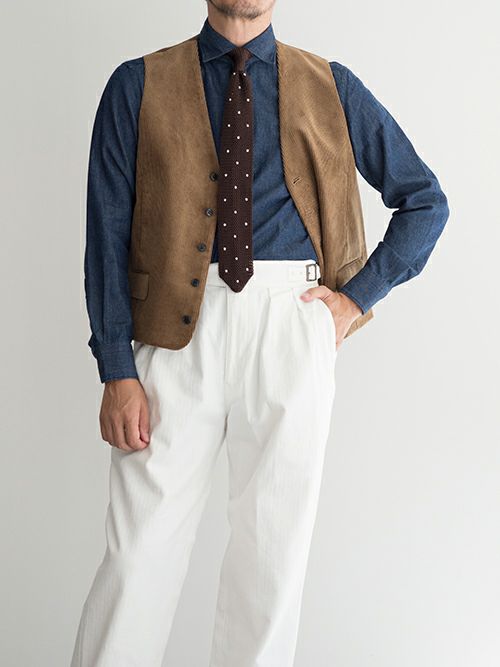 カットソーやシャツの上にプラスワンのアイテムとしての着用がお薦め。ドレス仕様のデニムシャツは、ベストの良さを存分に引き出してくれる相性の良いアイテムです。もちろん、ジャケットスタイルのインナーとしても申し分のない一着です。