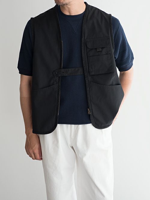 収納力抜群なポケットがフロント、バックに多数配置されており、男心をくすぐる機能性がそのままデザインの高さにつながったベスト。背面の大きなポケットはドローコード仕様です。