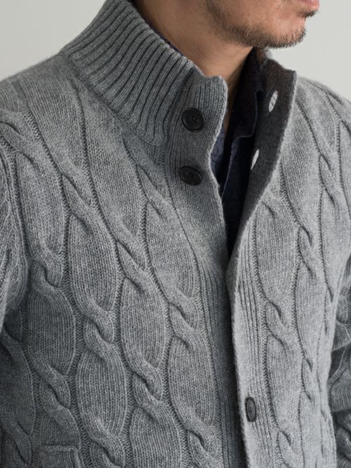 厳選されたウールを使用したケーブル編みのローゲージニット。ハンドポケットが付いており、アウターとしての見栄えも良い一着です。