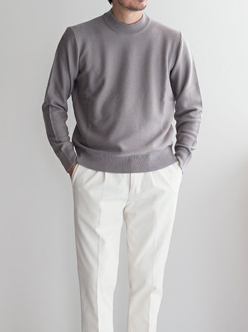ミドルゲージの程よい厚みで、一枚の着用も様になり、インナーとしてもかさばらない万能ニットです。ボトムスのコーディネートは、軽やかなホワイトパンツからスラックスまで合わせられ、この秋冬に活躍間違いなしのアイテムです。