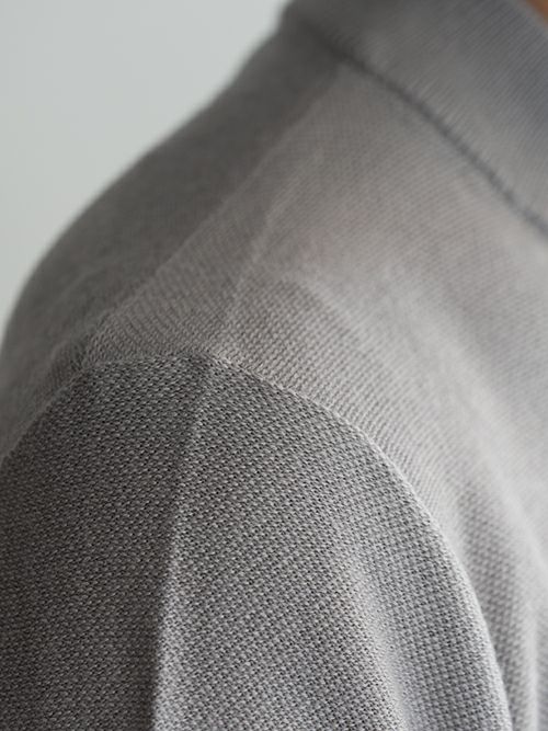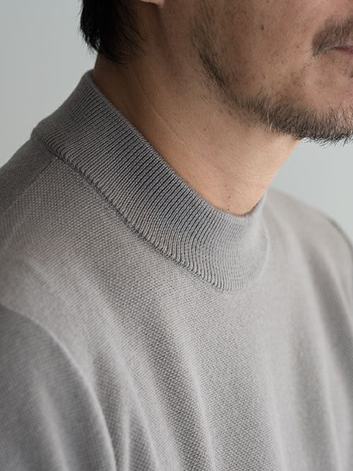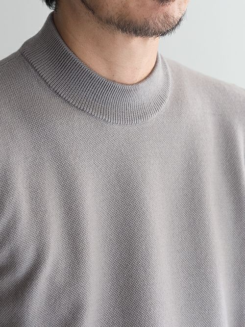 鹿の子編みのウール100%モックネックニット。首元裏にボーダー柄をあしらっており、見えない部分にも遊び心を感じます。