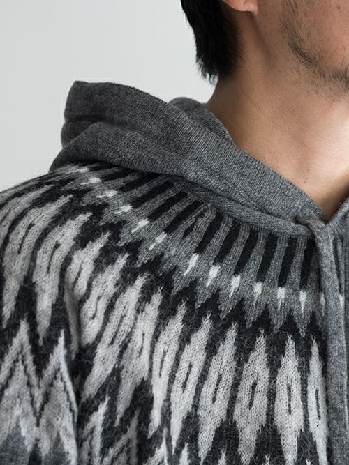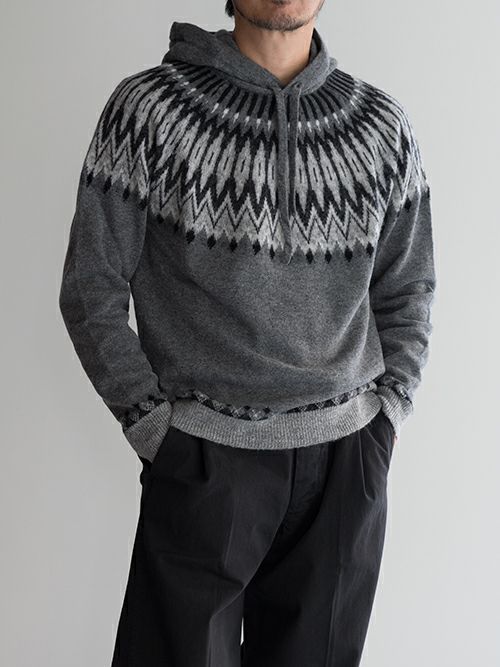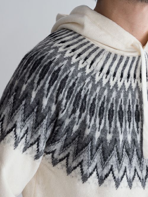 ウール、アルパカ、ナイロン混のニットフーディー。ノルディック柄がどこかレトロな雰囲気を演出しつつ、決して幼い印象にならないバランス感覚が抜群のデザインです。