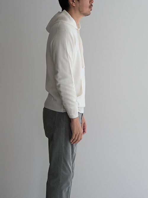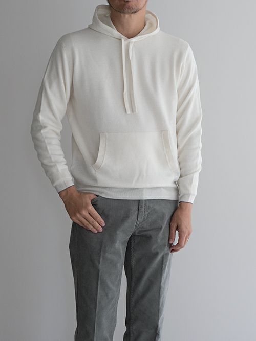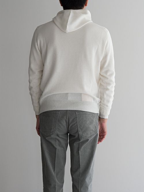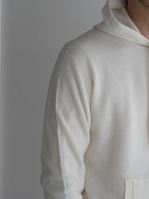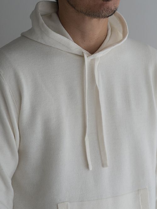 ウール100%のニットパーカー。ボリュームを抑えたフードとフロントポケットが、上品な大人の印象を演出してくれます。横に伸縮性があり、着心地も抜群。とても柔らかで、包み込まれるような肌当たりの一着です。
