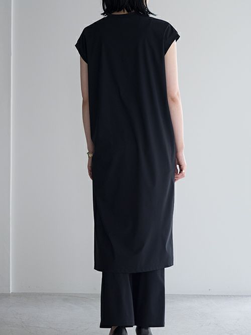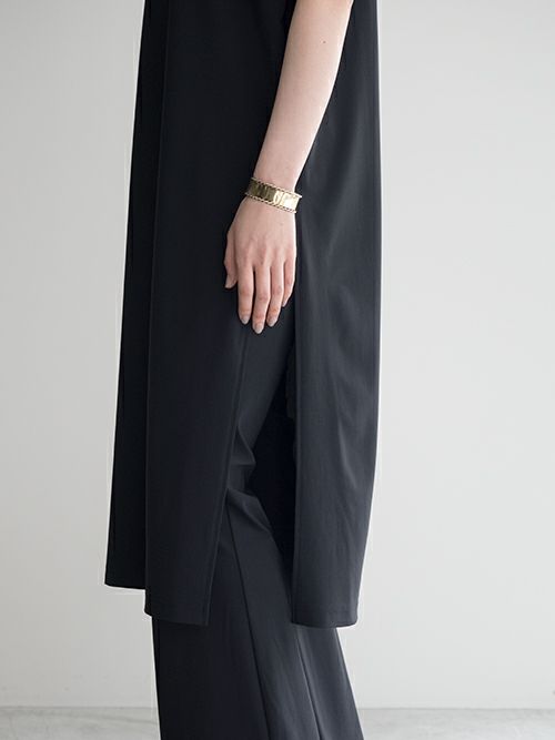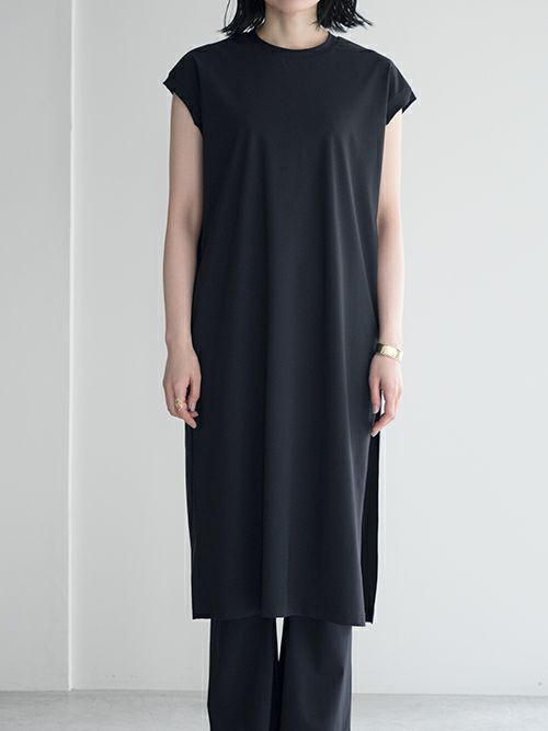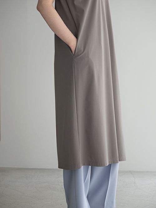 ストレッチ素材でさらりとした着心地のワンピース。片側には深くスリットが入り、パンツやロングスカートなどとのコーディネートを幅広く楽しめる一着。