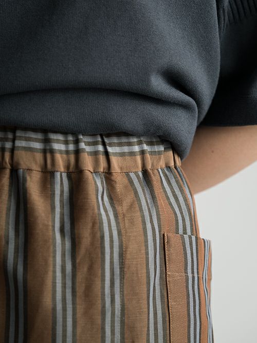両サイドのビッグポケットがスタイリングのアクセントに。リネン混のシャリ感のある素材で、夏でも涼しく履いて頂けます。ウエストはゴム仕様に加え、内側付属のドローストリングで調整可能です。