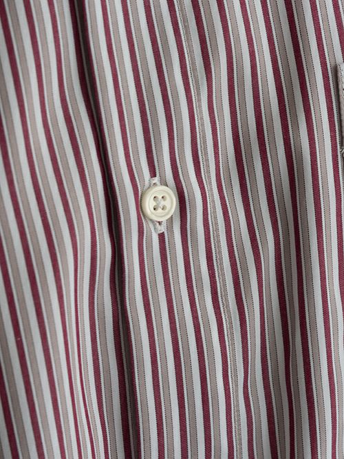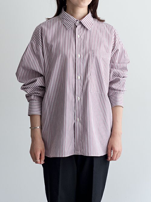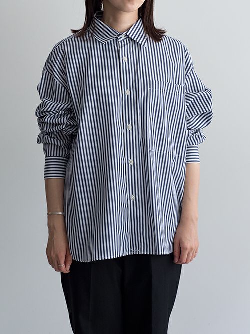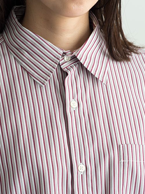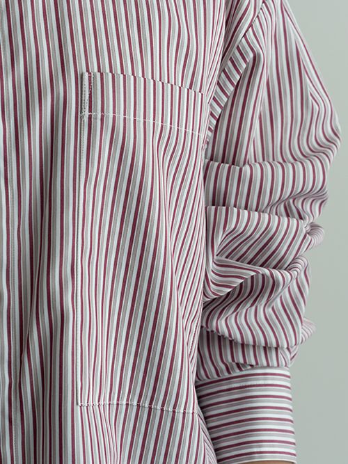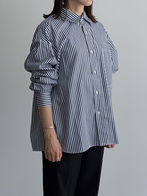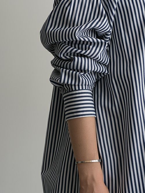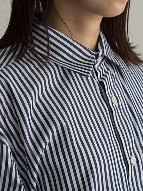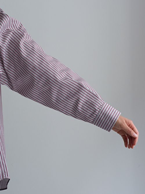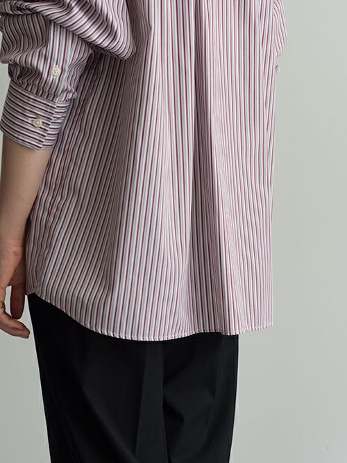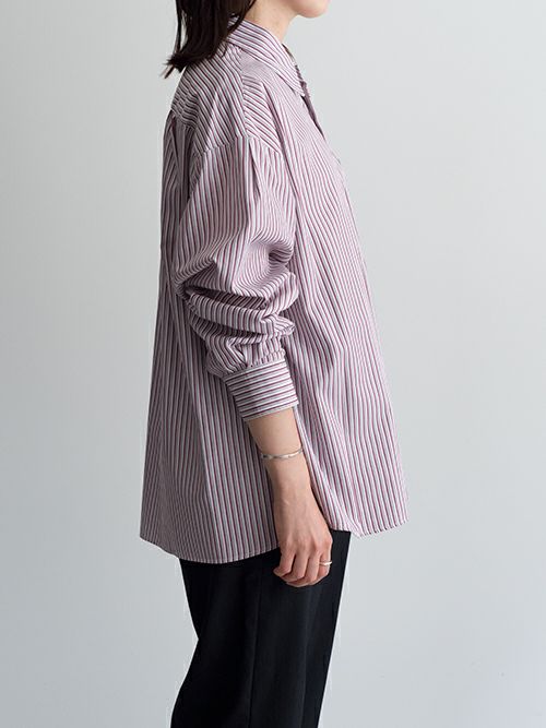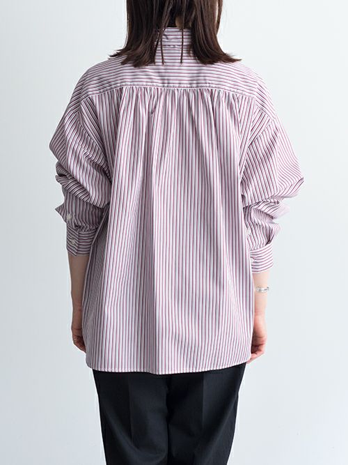 バックスタイルのヨーク切り替えからのボリュームのあるギャザーが印象的なピンストライプ柄シャツ。