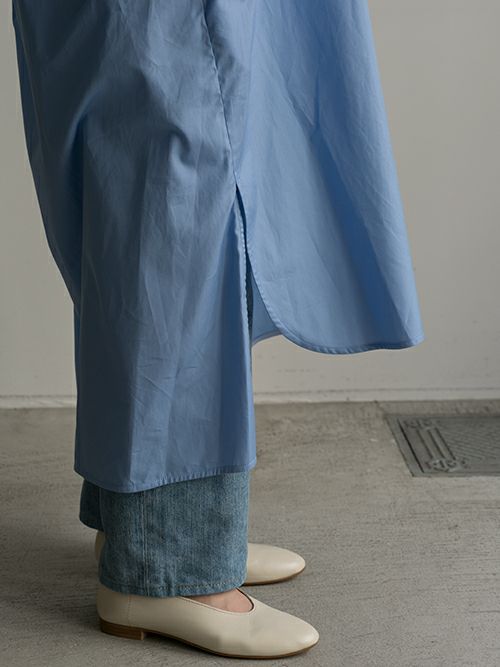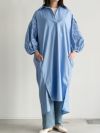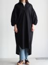 袖のボリューム感とすっきりとしたボディシルエットのバランス感が絶妙なワンピース。適度にゆとりのあるデザインで、楽ちんなのにきちんとして見えるのがポイントです。素材はハリのあるコットンですがポプリン素材でほどよいツヤと光沢が上品な装いに見せてくれます。
