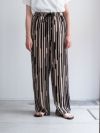 肌触りが柔らかくそよぐパンツ。大胆な柄ですがモノトーンをベースにしており程よい太さなので合わせるアイテムを選ばずにマルチに活躍するアイテムです。ウエストはゴムにドローコードで多少の絞っていただいて調整が可能です。トップスインのスタイリングもおすすめです。