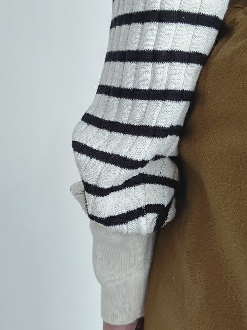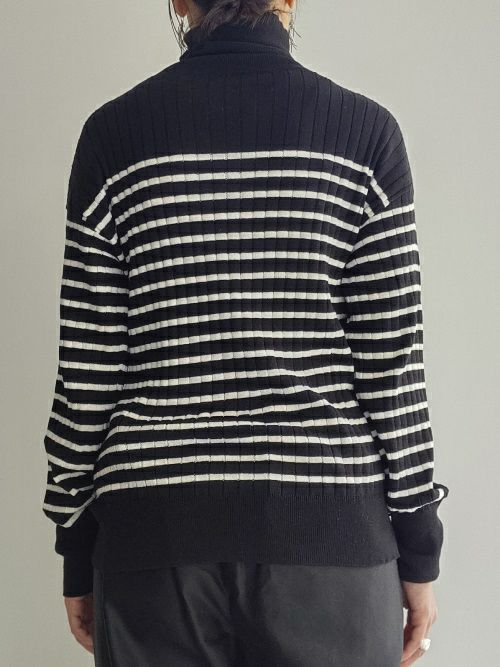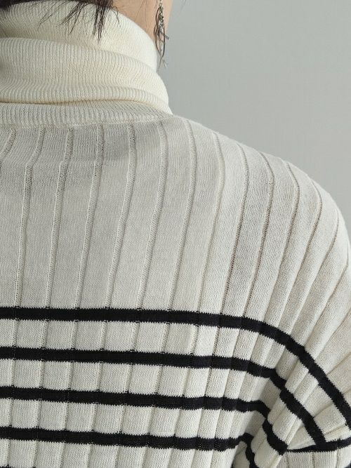 インナーにも1枚でも活躍するボーダータートルネック。大きなリブ網の凹凸が体のラインを目立たせずに着用出来ます。