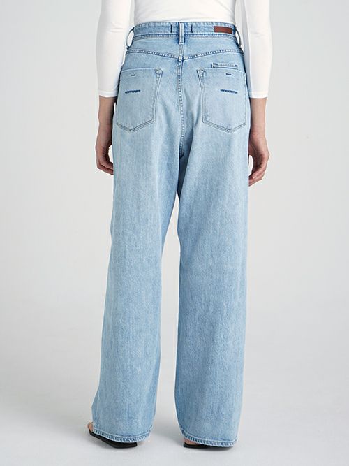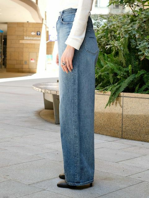 太腿から裾にかけて太いストレートシルエットのJOAN。メンズの太めジーンズを女性が履きこなすイメージです。ボリュームのあるパンツですが、ウエストがタイトで細く、華奢に見せてくれます。