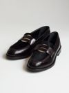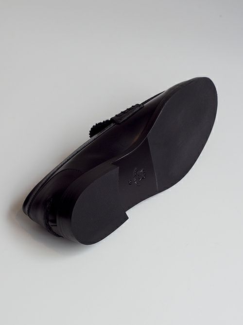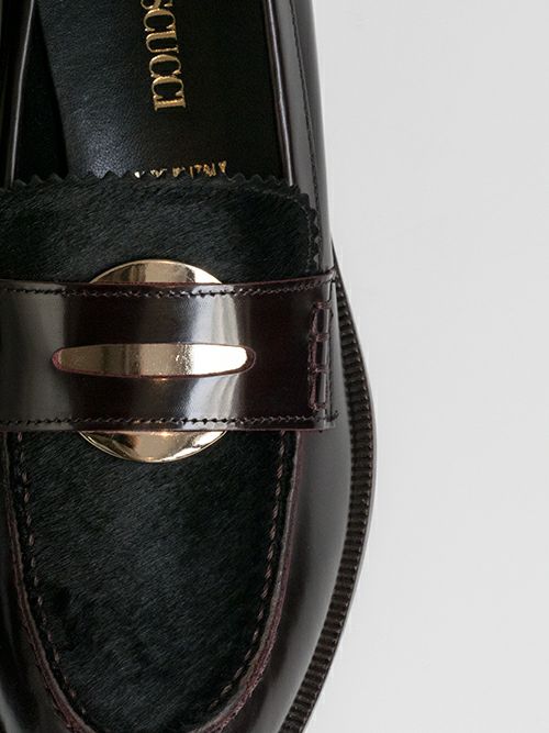 アッパーに表革とハラコのコンビで仕上げる事で新鮮な佇まいのコインローファー。ラウンド型の金具も特別感を演出するアクセントになっています。
