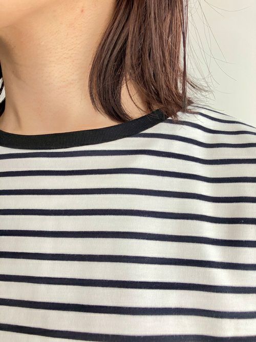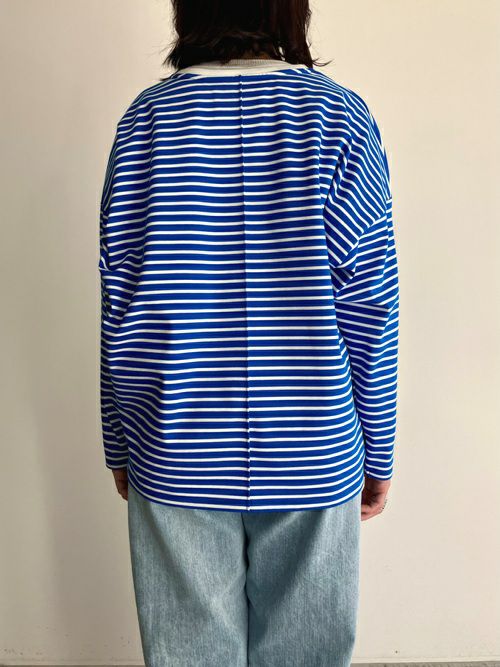 ドロップショルダーで立体的なコットンボーダー。後ろ身頃でステッチが入っており単調になりがちなボーダー柄をシンプルにデザインしています。