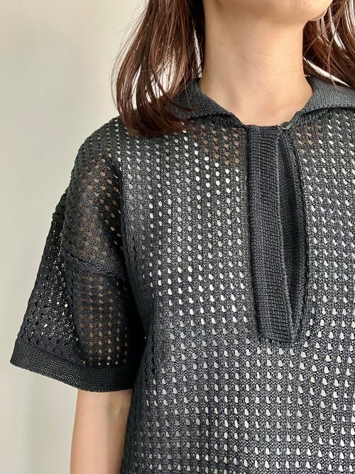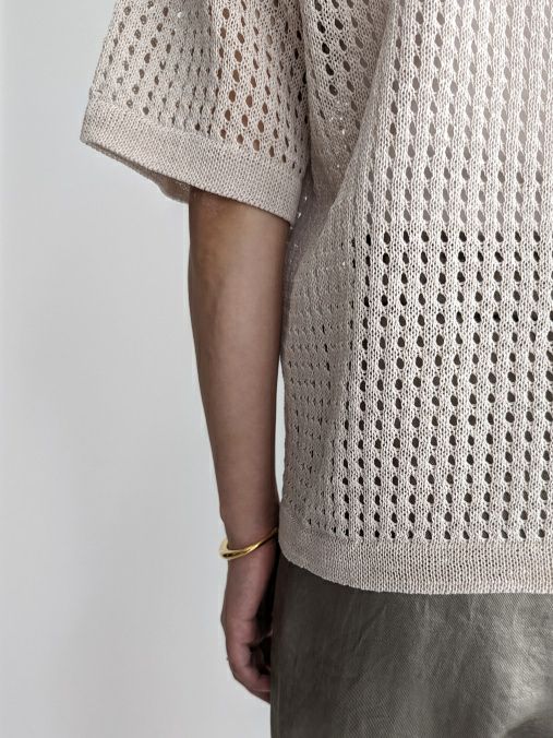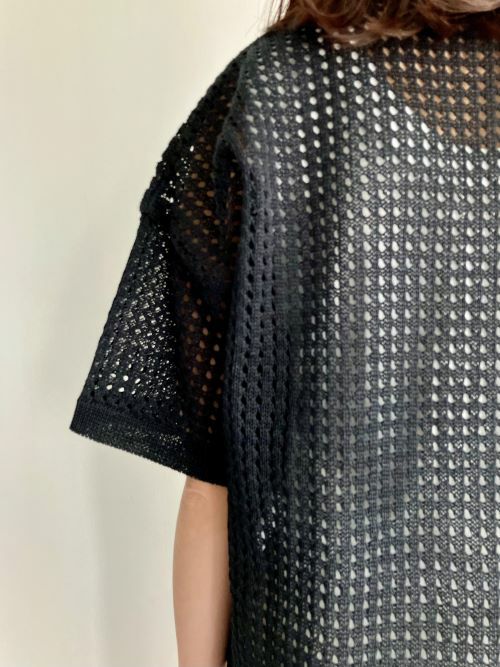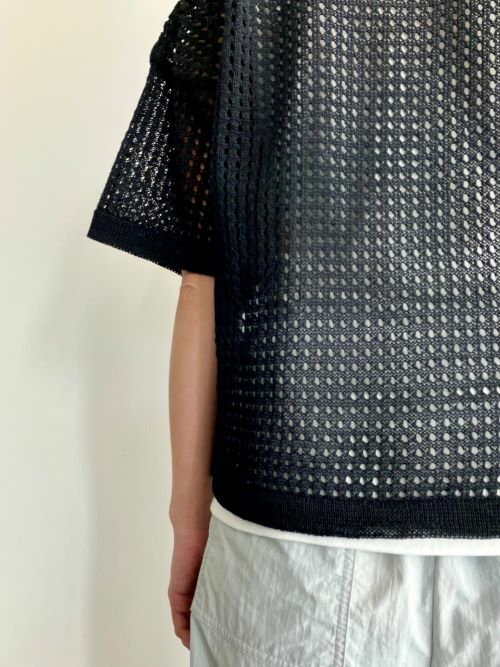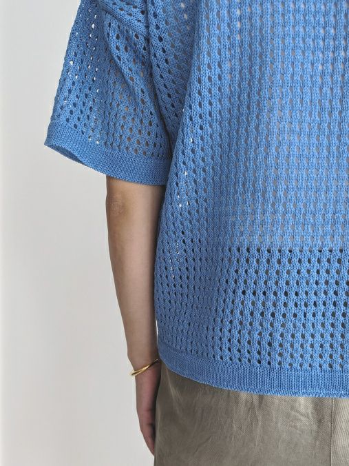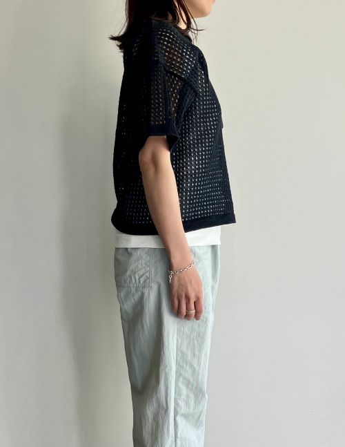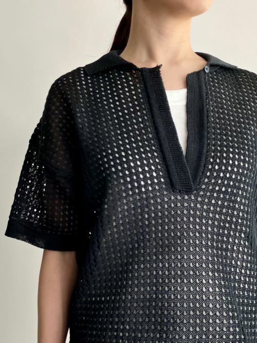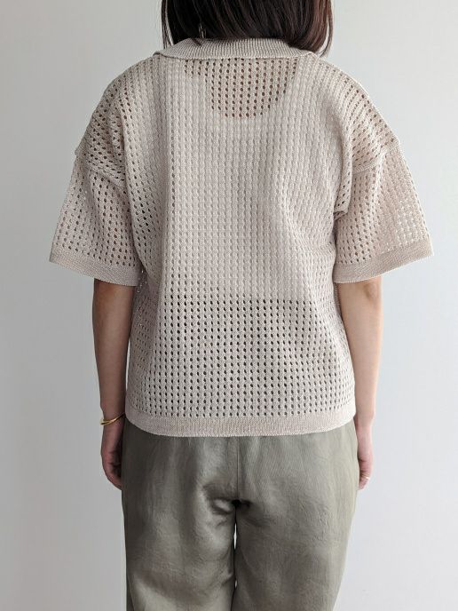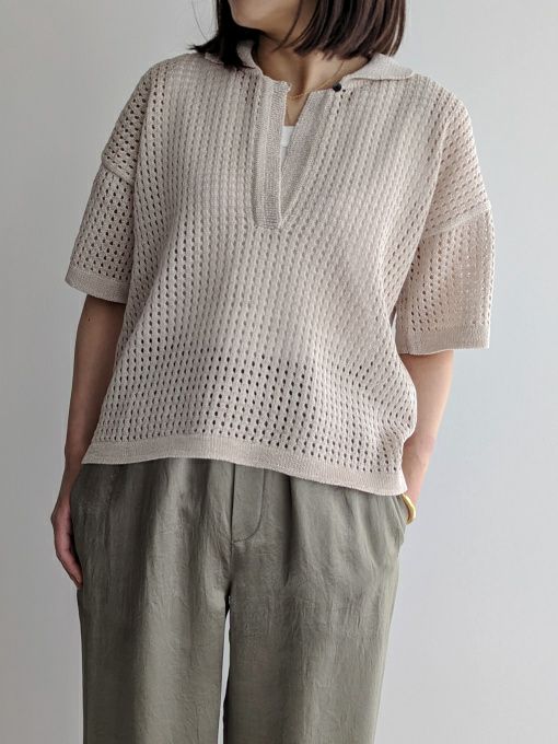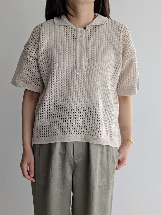 ショート&リラックスフィットのポロニット。ベーシックなアイテムゆえにギマ加工を施した素材感と大きなメッシュがシンプルになりがちな春夏のコーディネートにアクセントを与え、印象的な1枚に仕上がりました。綿の細番手にギマ加工を施したテープ状の編み糸を使用し、ハリ感と清涼感にこだわった春夏に最適な素材です。大きめのメッシュが、シンプルになりがちな春夏のコーディネートにアクセントを与えます。