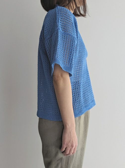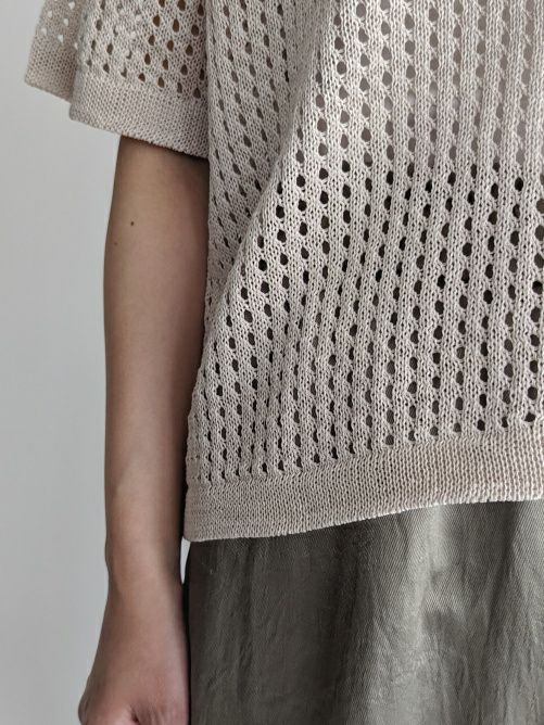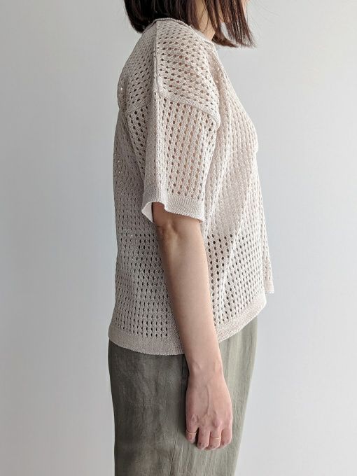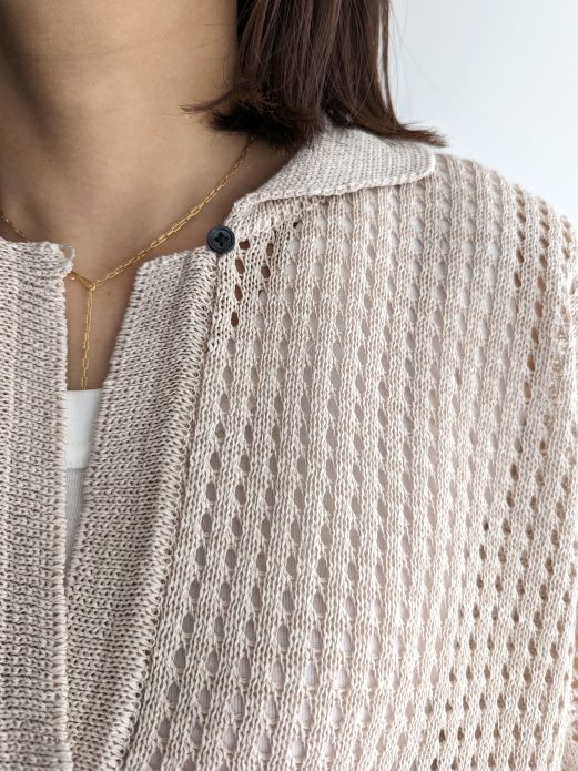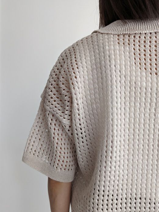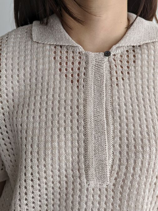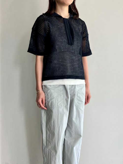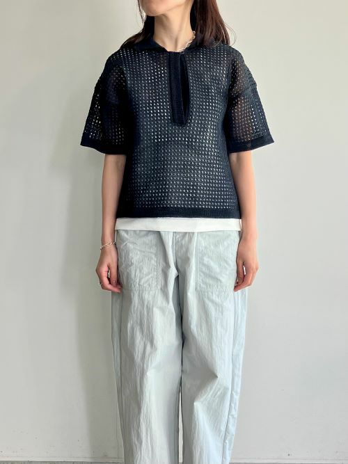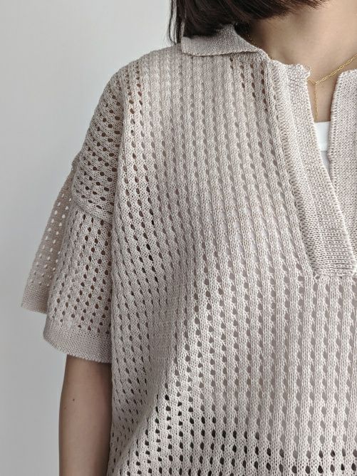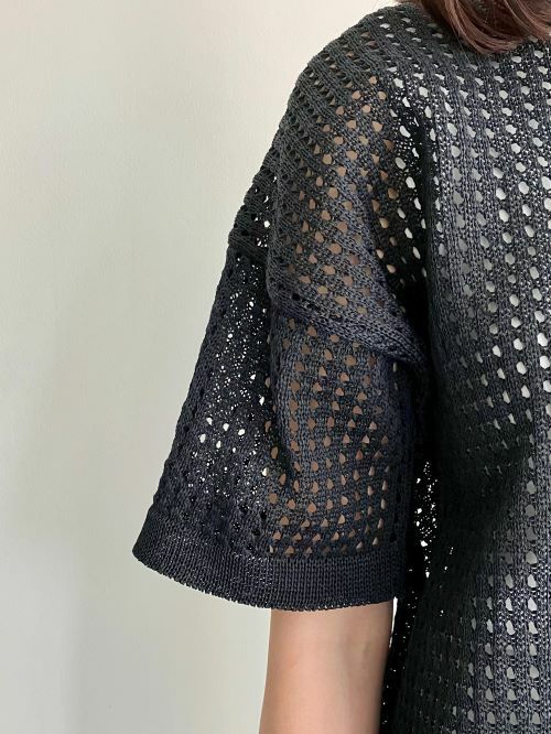 ショート&リラックスフィットのポロニット。ベーシックなアイテムゆえにギマ加工を施した素材感と大きなメッシュがシンプルになりがちな春夏のコーディネートにアクセントを与え、印象的な1枚に仕上がりました。綿の細番手にギマ加工を施したテープ状の編み糸を使用し、ハリ感と清涼感にこだわった春夏に最適な素材です。大きめのメッシュが、シンプルになりがちな春夏のコーディネートにアクセントを与えます。