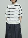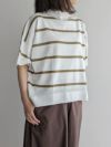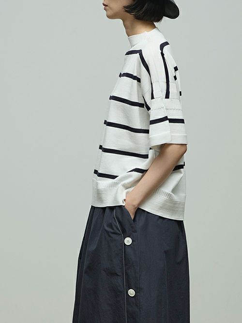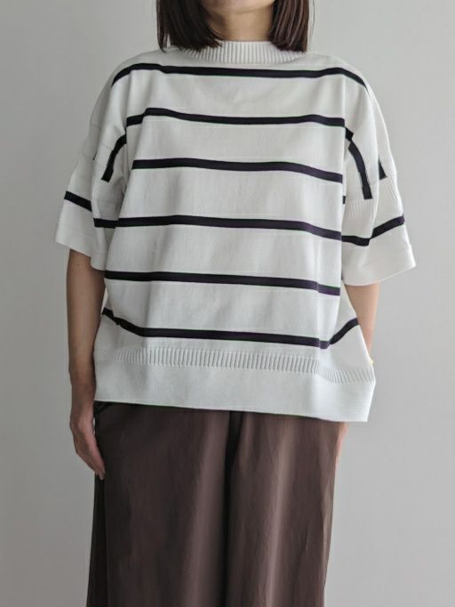 オーガニックコットンの中でもピュアホワイトと呼ばれる糸にこ だわったニットシリーズです。Tシャツ感覚で着られる定番の半袖ニットプルオーバー。体のラインを拾わないゆとりあるシルエットと、肘まである5分袖が気になるところをカバーします。ベーシックなボーダー柄に、シルエットで遊び感をプラス。