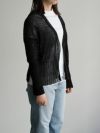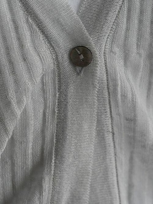 透け感のあるVネックのリブニットカーディガン。着丈が少しショートでサイドのスリットも女性らしさを演出してくれます。リネンの細い糸番手を使用し光沢と柔らかな透け感が初夏から夏の上品な羽織におすすめです。