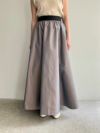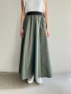 上質な綿糸と摩耗性、摩擦性に優れたポリエステル糸を混紡。特徴のある2種類の糸を使用することで光沢感を持たせつつ、しっかりとした張り感と通気性、空室性、防汚性と機能性を持つハイブリッドなチノ素材を採用したワイドなフレアスカート。2色の糸を使用することで生地の表情に立体感を持たせています。6つのパーツに仕切ることで均等に立体感のあるフレアが入るように設計されたスカート。ウェストをゴム仕様にすることでで着やすさとコントラストのデザインをプラス。