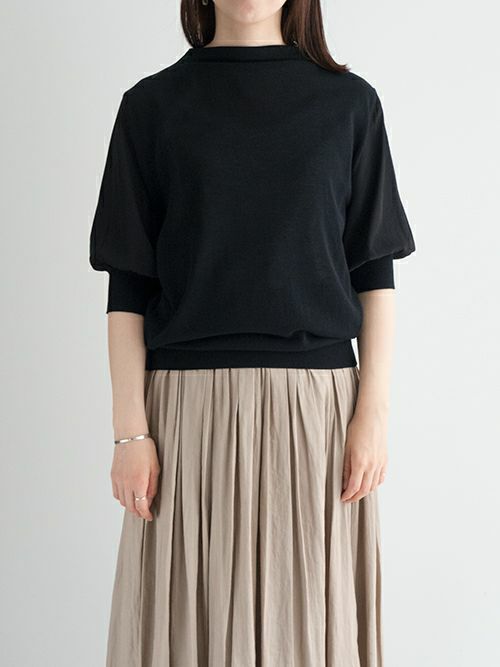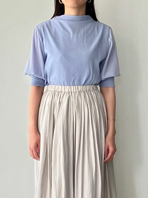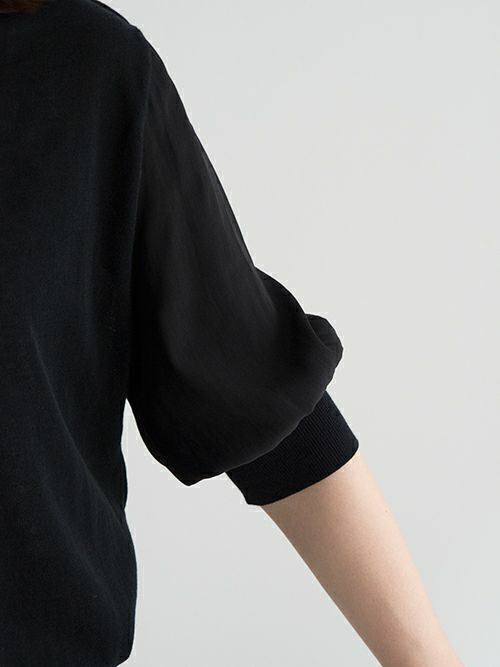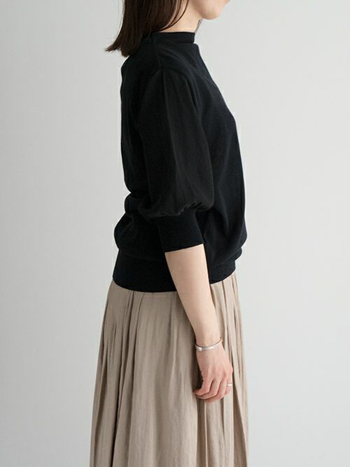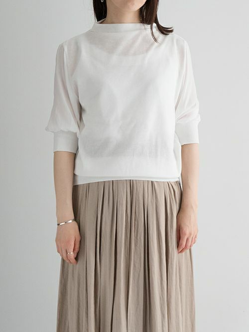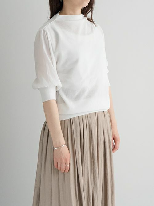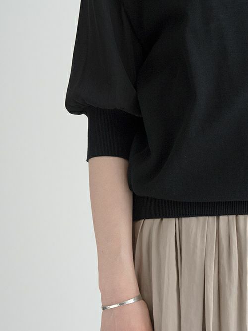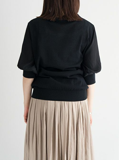 クラシカルなネックラインと柔らかいチュール素材で上品な印象のニットです。袖部分は透け感がなく、色々なシーンで重宝するアイテムで、きれいめからカジュアルまで幅広く着て頂けます。