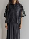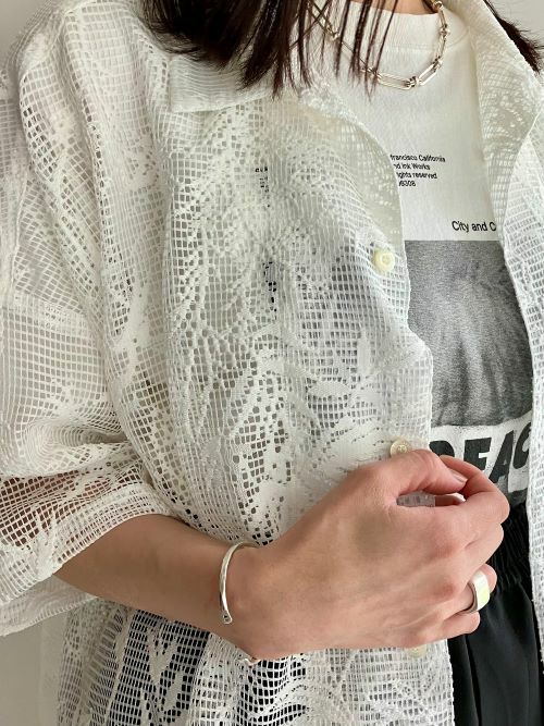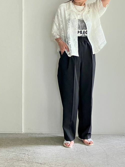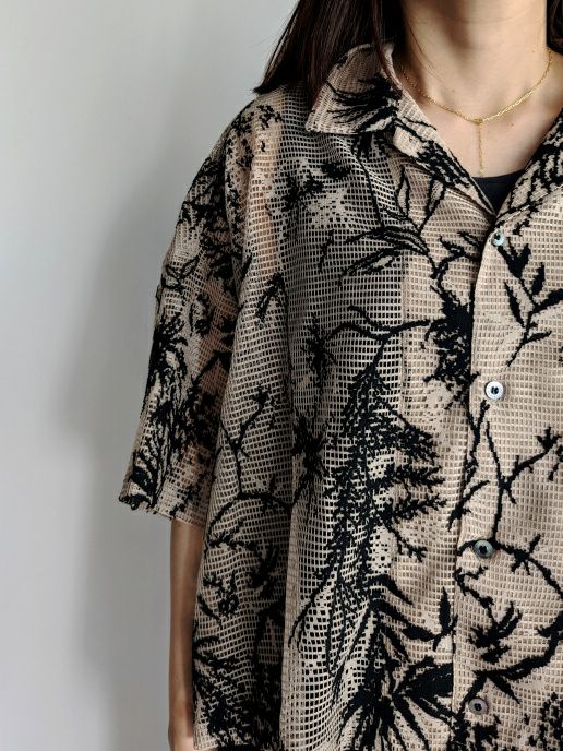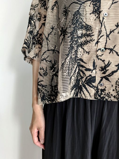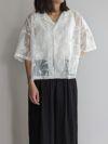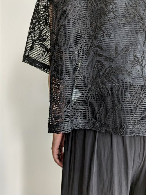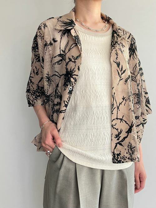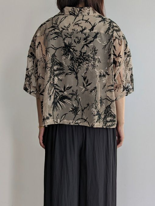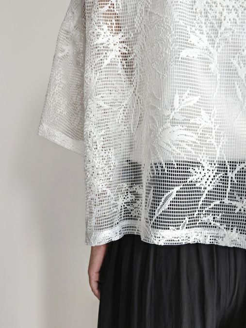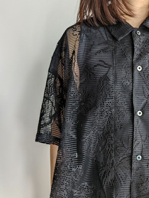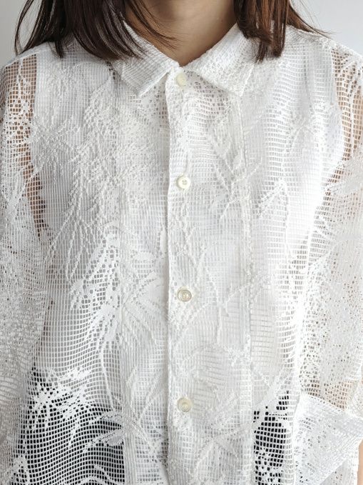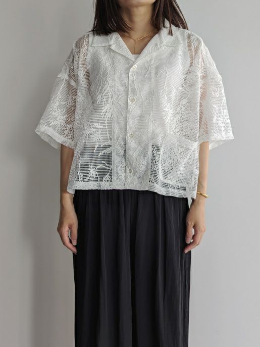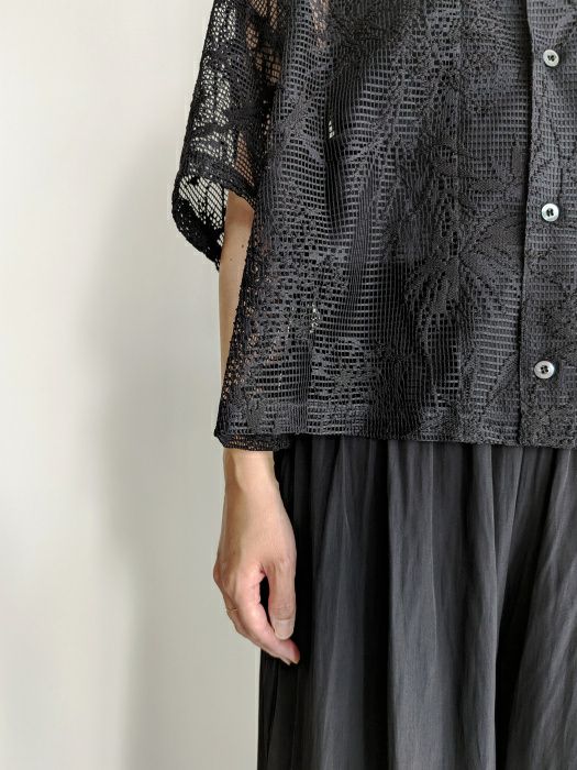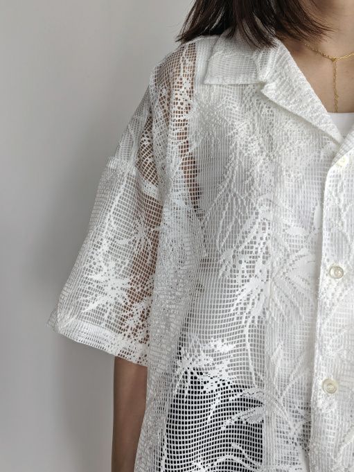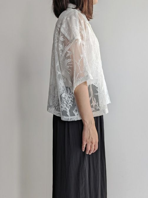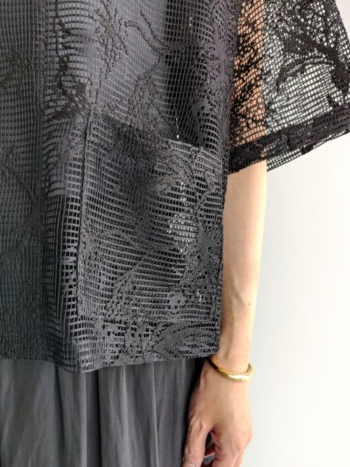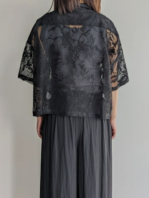 ポリエステル素材で柄に膨らみを持たせて立体的な仕上がりになっています。レースですが甘さを抑えた柄がスパイシーにきいています。短めの着丈で、ご身長問わずバランスよく見せてくれます。スラックスやカーゴパンツなどのメンズライクなアイテムに合わせるのも◎
