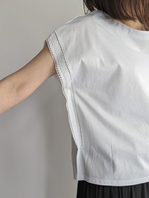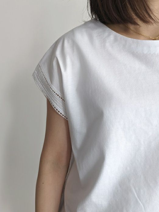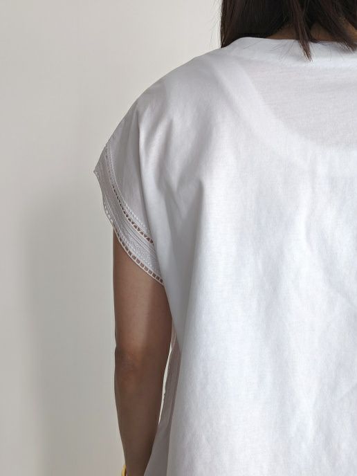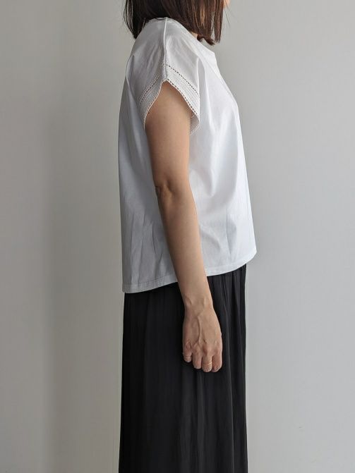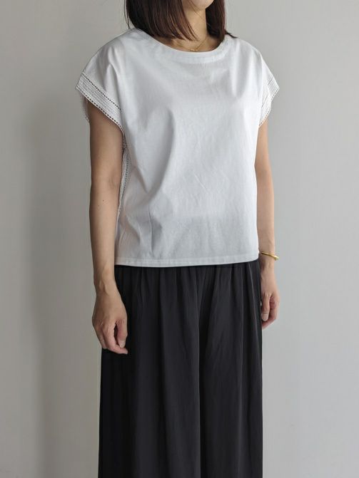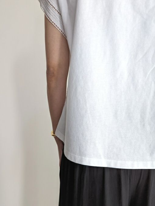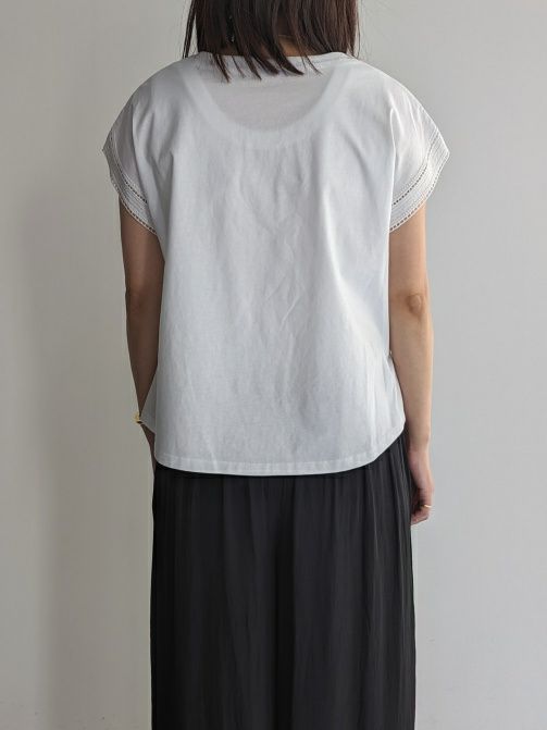 シンプルなカットソー素材に袖口から刺繍がポイントのフレンチスリーブ。同色の素材が主張しすぎず女性らしく、また爽やかな印象です。Tシャツ感覚で上品な装いにも合わせれますのでボトムを選ばずコーディネートしやすいです。