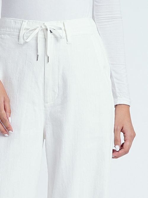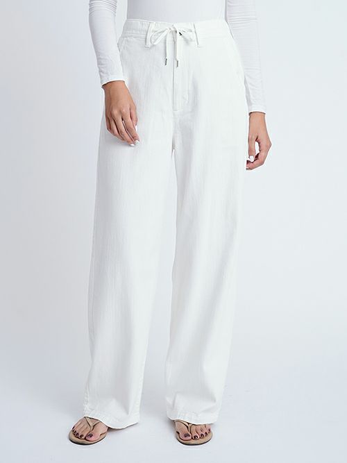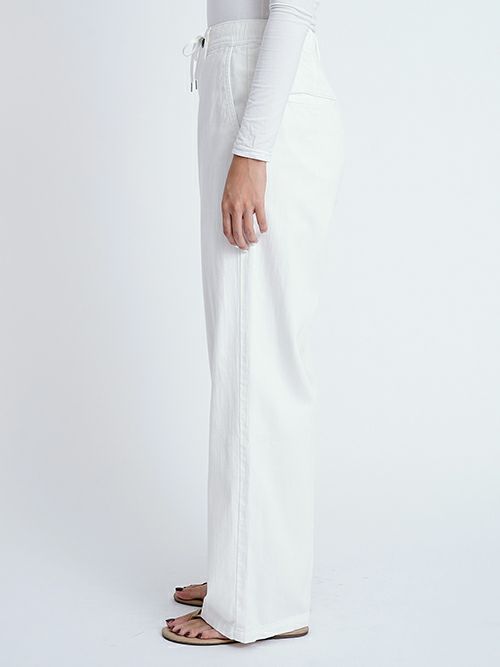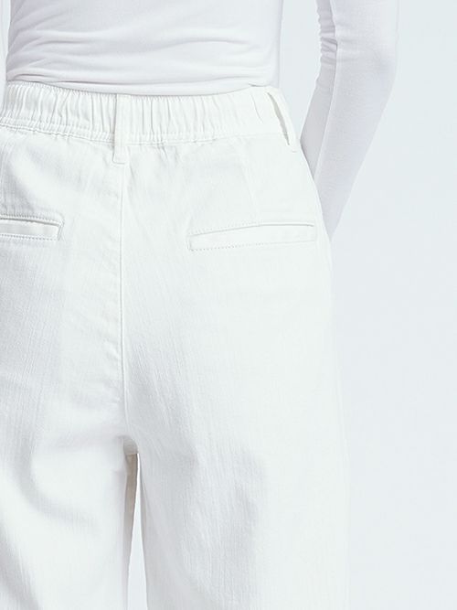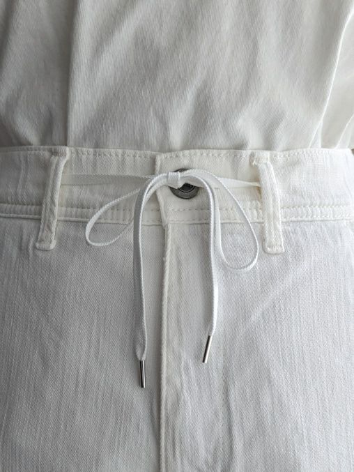 ウエストのドローコード(内側に収納可能)でサイズの調整ができ、背面はゴム仕様。シルエットは、程よいゆとりのリラックス感がありながら、絶妙な裾幅ですっきりと綺麗に履いていただけます。