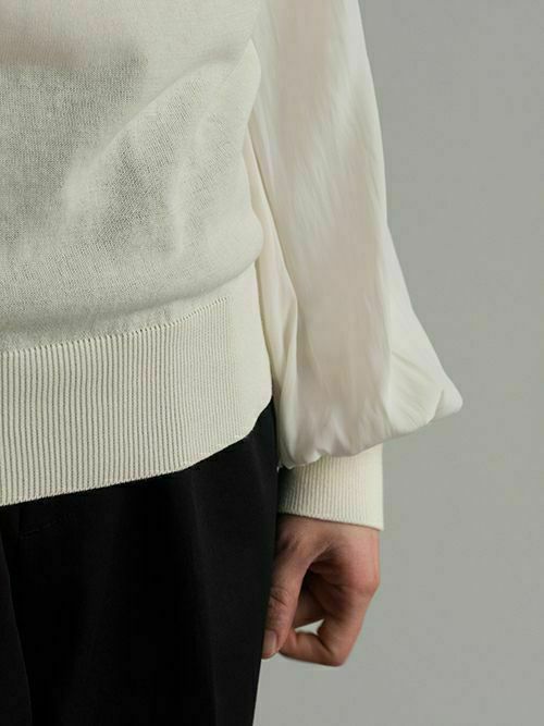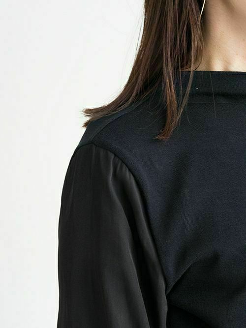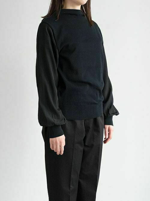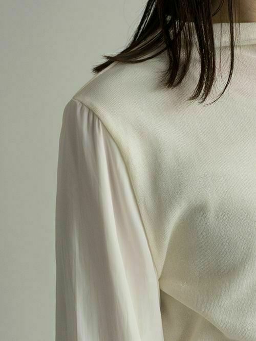 クラシカルなネックラインと柔らかいチュール素材で上品な印象のニットです。袖部分は透け感がなく、色々なシーンで重宝するアイテムで、きれいめからカジュアルまで幅広く着て頂けます。