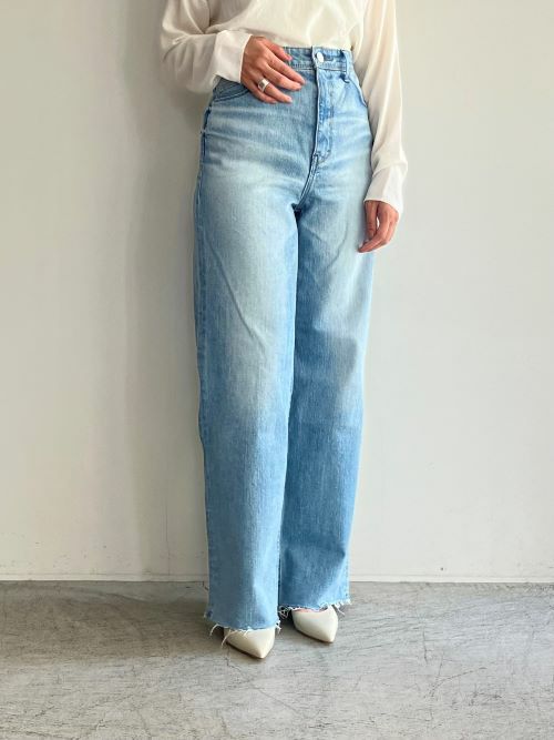 深めな股上にも関わらず、ヒゲやスリによる立体感と、ヒップのハイライトを高めに入れることでスタイルアップ効果が期待できる一着。お裾はスタイリングのアクセントになるカットオフ仕様です。