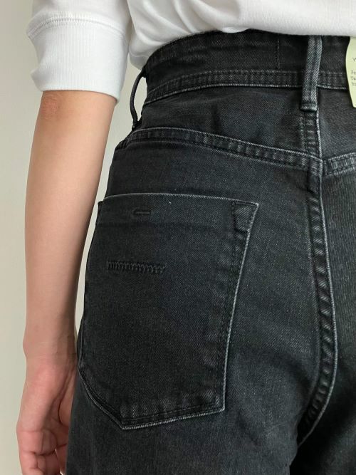 フラットな印象になりやすいカラーパンツとは違い、ブラックデニムに加工感を施すことで、デニムならではのアタリ感が生まれ、のぺっとした印象にならないブラックジーンズです。通常、ブラックデニムは黒のタテ糸×白のヨコ糸で織られているモノが多いので、加工するとコントラストが付きすぎてしまい、カジュアルな印象に仕上がりがちですが、この品番は黒のタテ糸×黒のヨコ糸で織られたブラックデニムを使用しているので、いい意味で加工感が付きすぎない、上品な印象のブラックデニムに仕上がりっています。カジュアルからキレイめまで、様々なコーディネートに合わせやすい1本です。