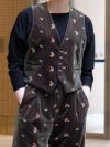 ベロア生地に花柄刺繍をあしらったレトロ感が可愛らしいベスト。コンパクトなサイズ感や、後ろ見頃に別地を使用するなど、敢えての本格的なドレス仕様が、お洒落で個性的なコーディネートを作りだしてくれます。