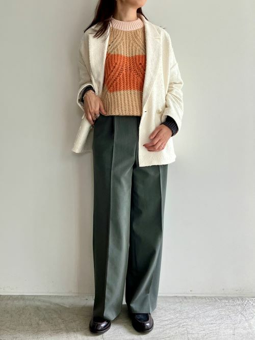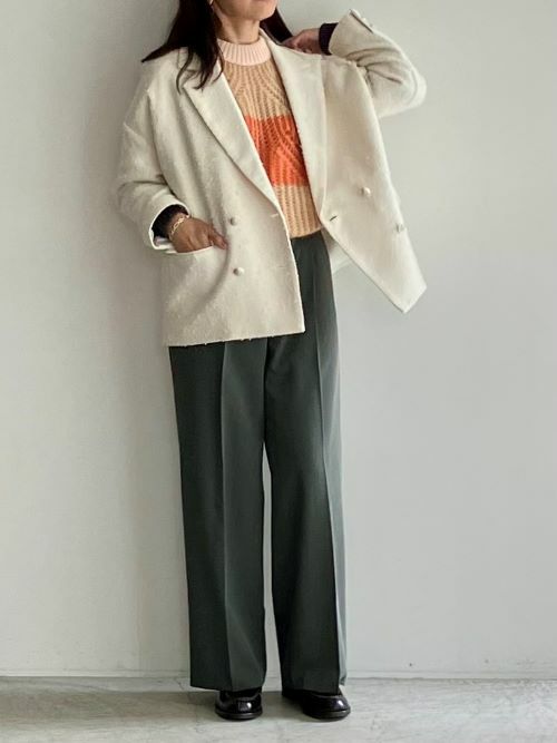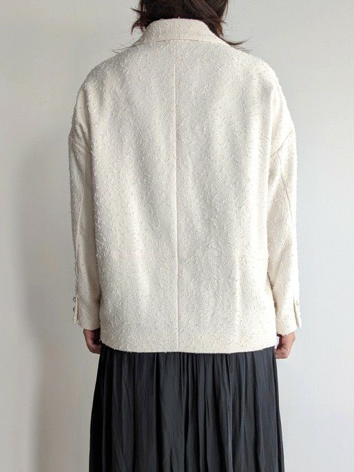 コットンの織生地にネップなどをあえて出したニュアンス生地が特徴のダブルジャケット。オーバーサイズのシルエットですが袖、着丈などはコンパクトにしてバランスのとりやすいフォルムにしています。中は総裏地でニット着用も可能で、軽いアウター感覚使いも出来ます。