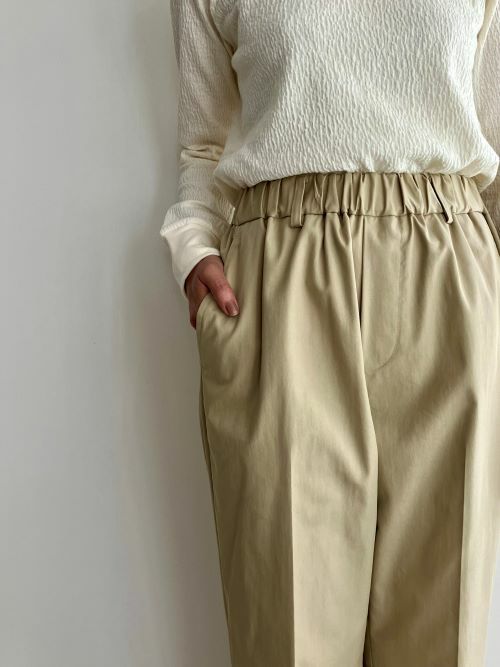 ウェストはゴム仕様に加えフィット感を高めるドローストリング仕様になっております。素材はコットンナイロンを使用した交識のギャバジン。ワッシャー感