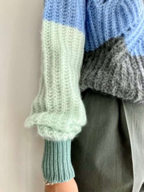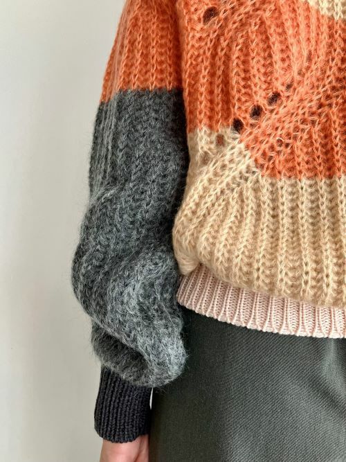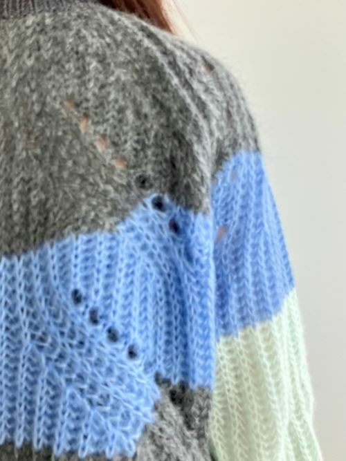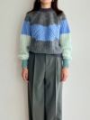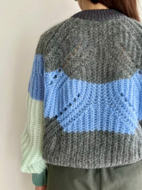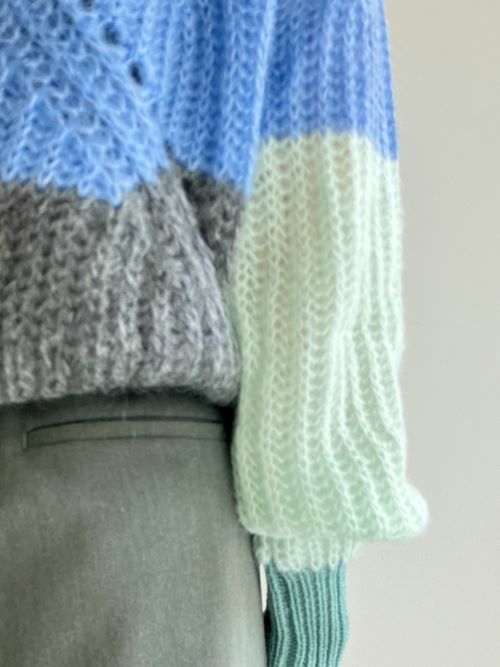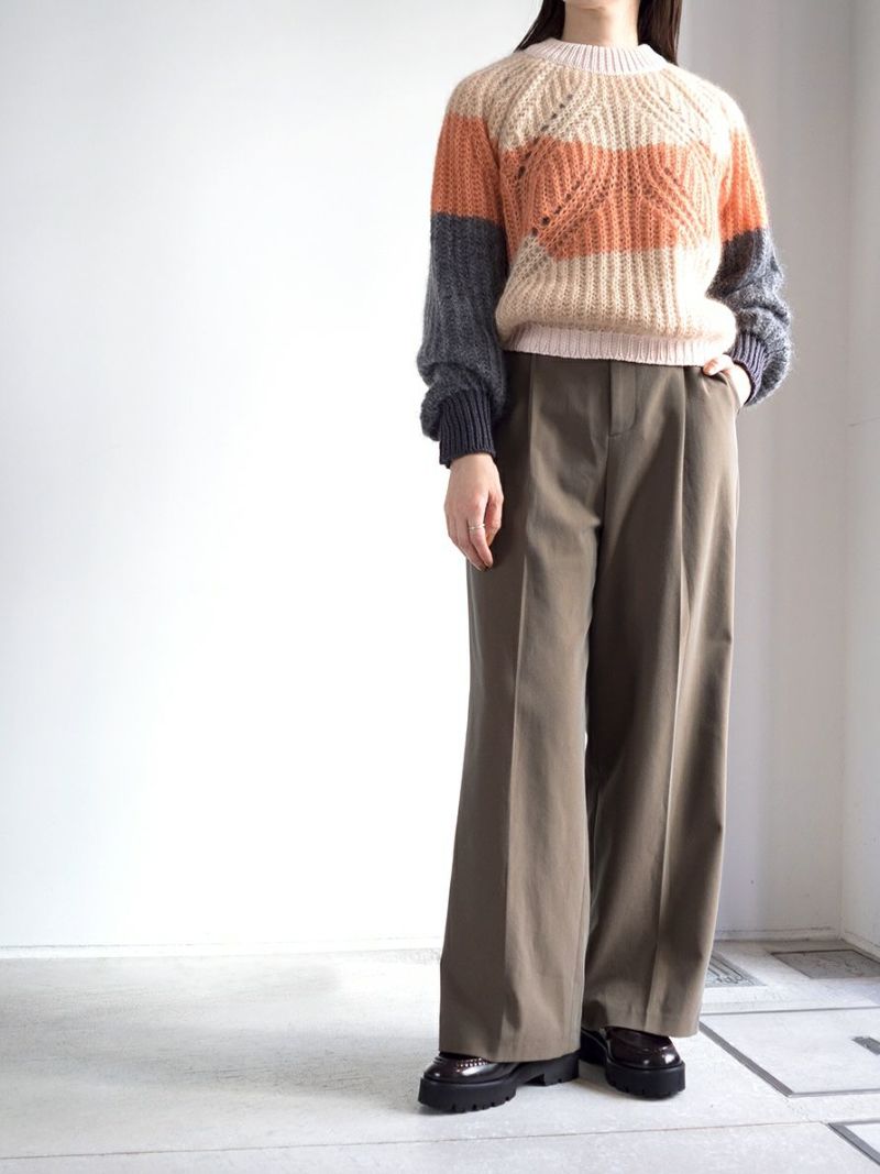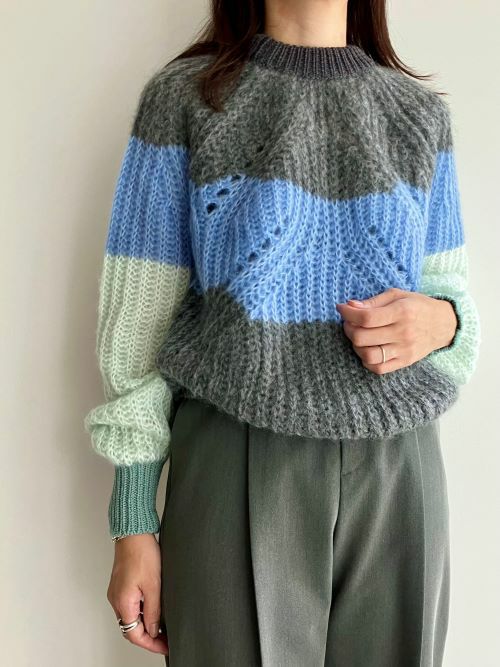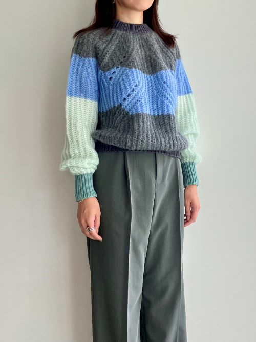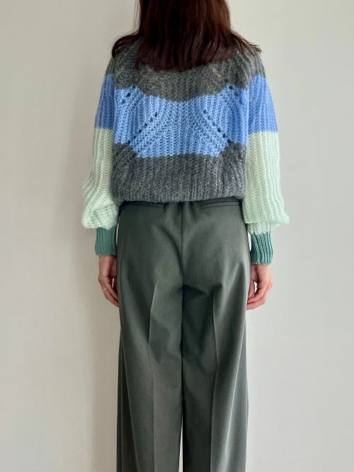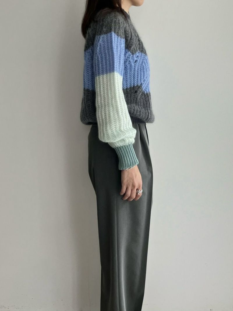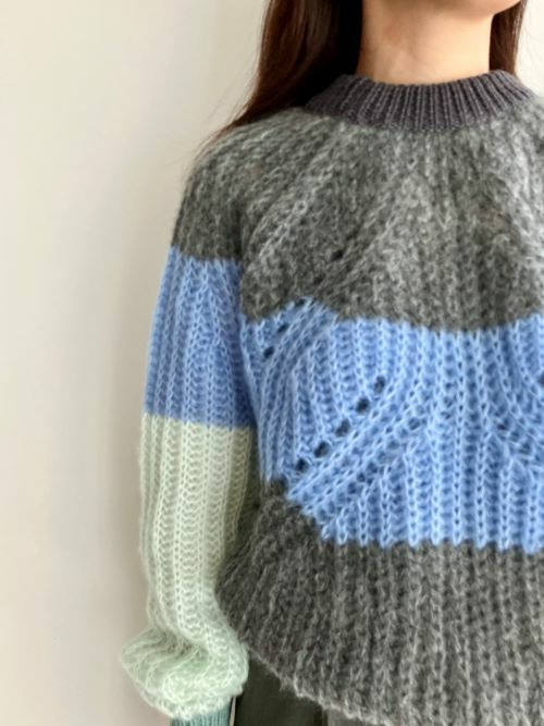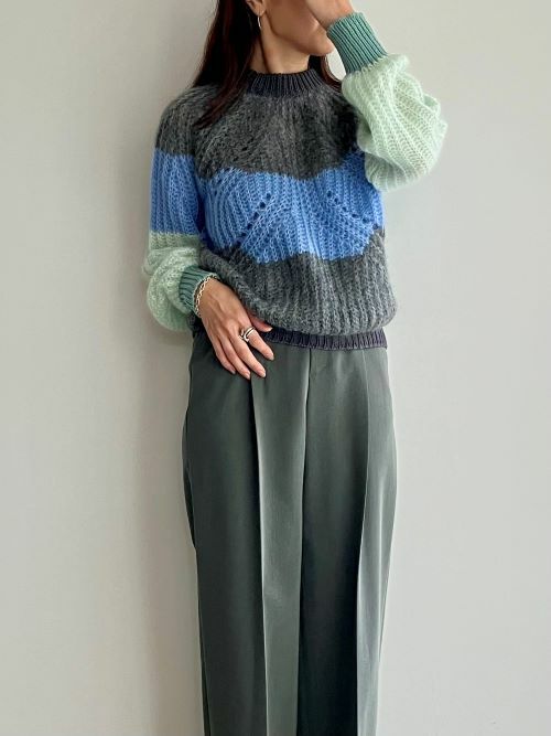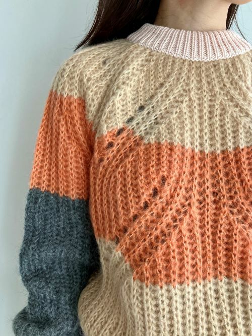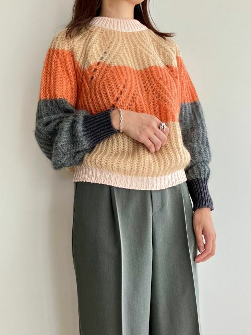 ふんわり空気を含んだモヘア混の糸で柔らかな編み模様がキャッチーなニット。マルチなカラーリングですが上品でコーディネートしやすい配色になっています。着用感も軽く着丈はややコンパクトになっておりスカートやデニムパンツ、またはワイドパンツなど、様々なボトムスと相性良くコーディネートしていただけ、スタイリングの主役となるアイテムです。着用感もふんわり軽量です。編地が大き目の為多少の透け感はございます。