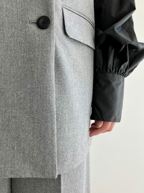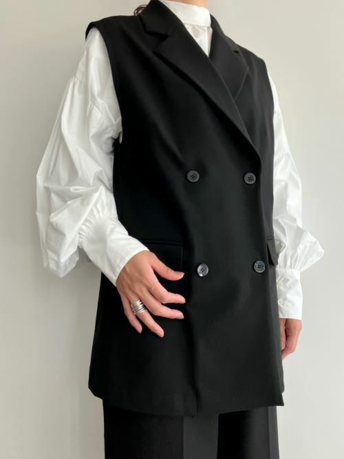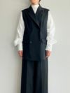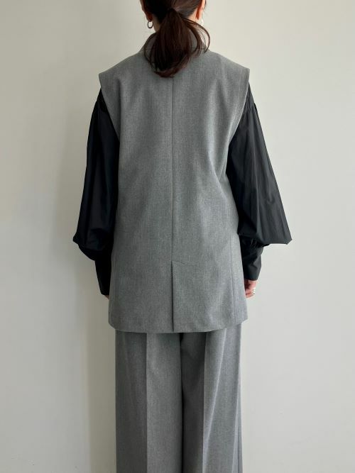 オーバーサイズではなく、適度なゆとりのあるスッキリしたシルエットです。程よい肉感のポリエステルとレーヨン素材なので、晩夏から長く着用できるアイテムです。生地感はソフトでふんわりしており普段使いはもちろん、オケージョンやオフィスなどでも活躍するジレです。