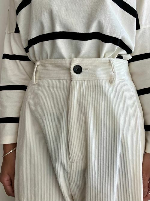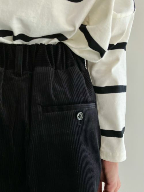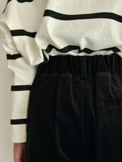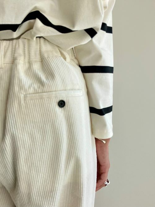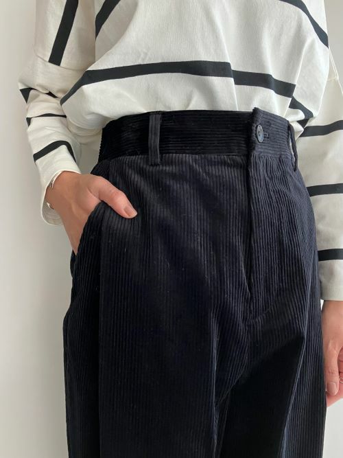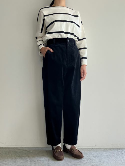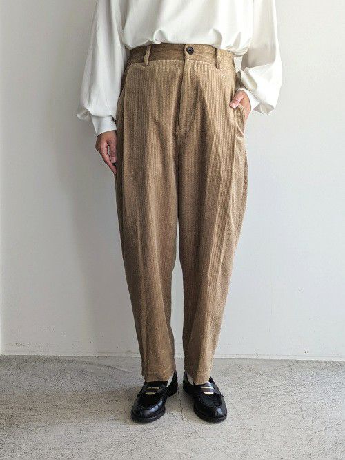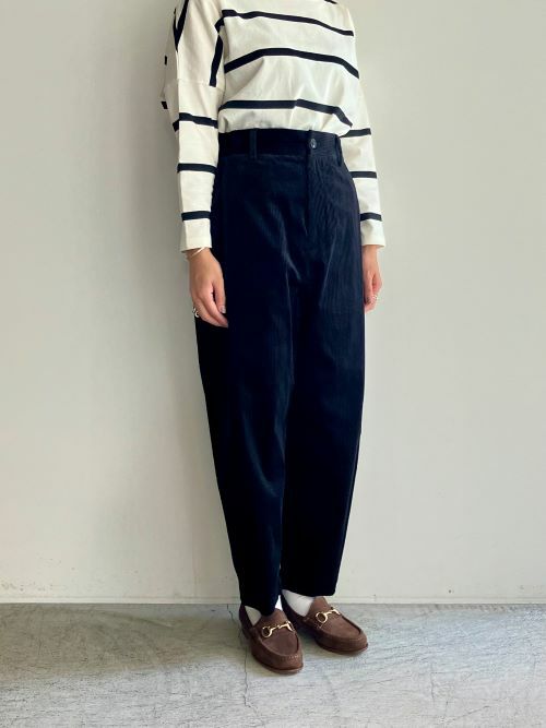 サイドに深めのタックを施したテーパードシルエットが特徴。腰回りにゆとりをもたせつつ、シームポケット仕様に。きちんと見える釦仕様のフロントにバックウエストゴムで履き心地にも拘りました。