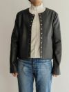 ノーカラーの定番的なフォルムに、フロントのシルバーボタンがアクセントになったエコレザーブルゾン。軽くで柔らかい着用感も嬉しい魅力。