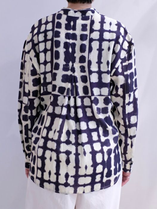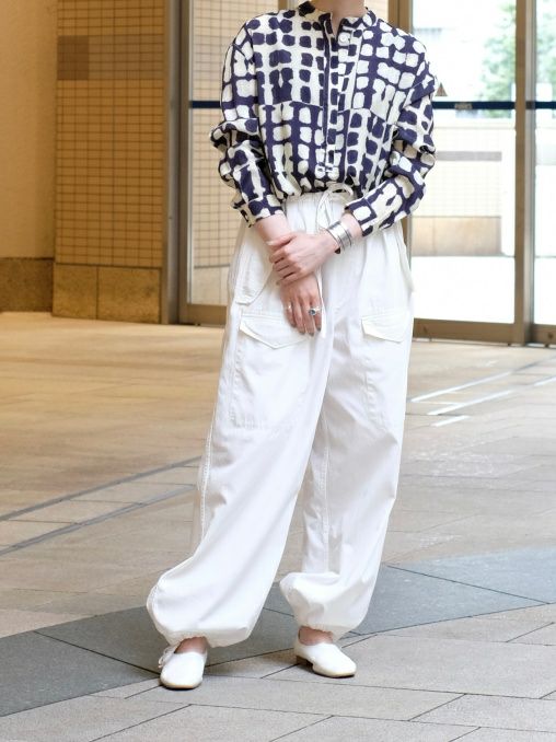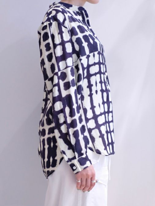 一見染め物と見間違ってしまうほど、精巧なプリント柄のプルオーバーブラウス。フェミニンになり過ぎないディテールが好印象ながら、とろみのあるレーヨン生地が程よく女性らしさも演出してくれます。