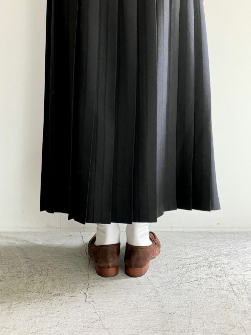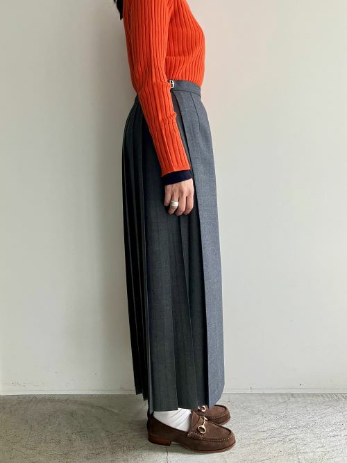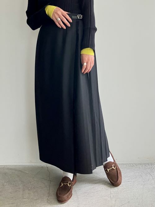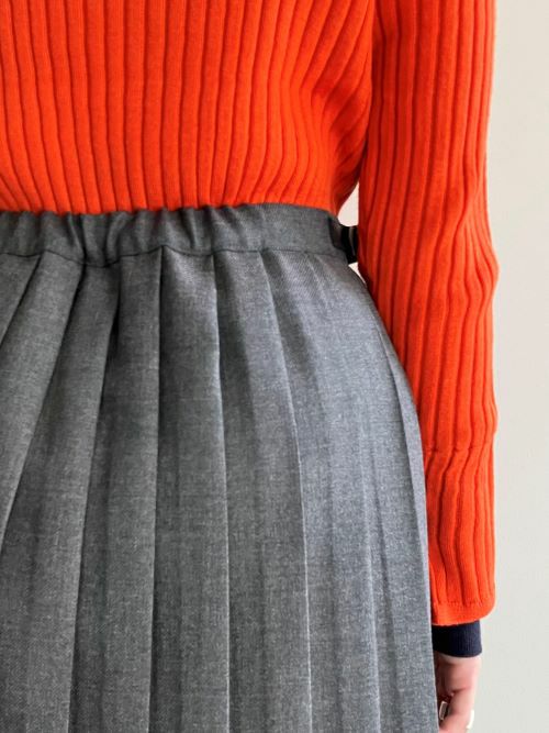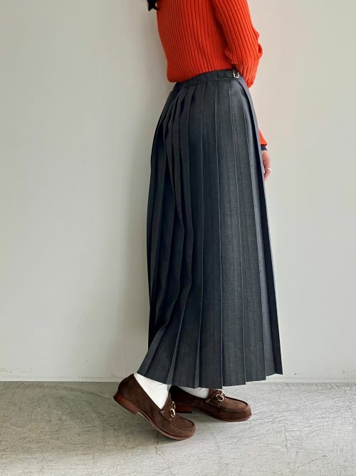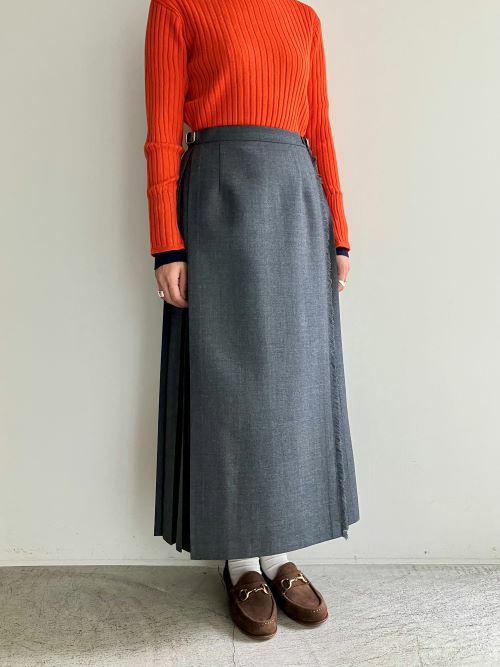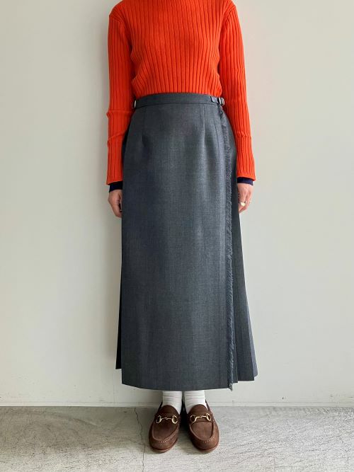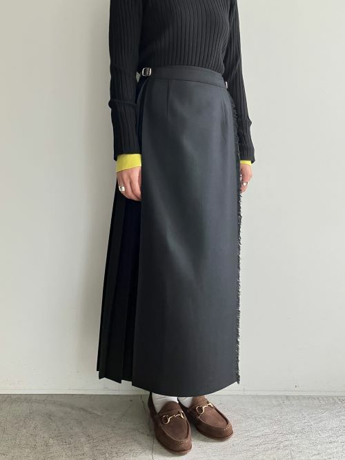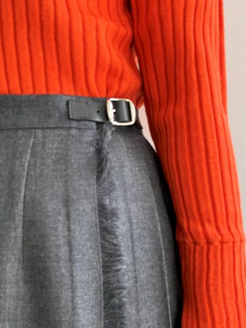 上質なキルト素材を使用した巻きスカート。サイドのレザーベルトでウエスト部分を調整して頂けるので、トップスインのスタイルもきれいにキマります。身長問わず履きやすい着丈になっており、フラットシューズやブーツなど、足元も選ばずに楽しめるのも嬉しいポイント。尚、ウエストはベルト3つ穴で位置真ん中のサイズになっております。ウエスト後ろはゴムが少しあり多少の伸縮がございます。