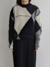 モノトーンのカラーに大きなダイヤ柄をはめ込んだ編地が、立体的なシルエットを醸し出してくれます。少しゆったりめのシルエットで、ボディーラインは気にせずカバーしてくれます。ネックや袖のリブなど、細部まで拘りが詰まった一着。重たくなりがちな秋冬スタイリングのアクセントカラーとなりお薦めです。