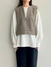 Vネックニットベスト。 ミドルゲージなので適度に目が詰まっており、それでいて軽く柔らかく暖かい素材です。 身頃、アームホールはゆったりめ、着丈は前後差があり前がショート丈のバランスが取りやすいサイズ感です。切り替えラインは縫い代外出しのカジュアルなディテールとなっております。旅行などにも意外とコンパクトで軽いので重宝します。