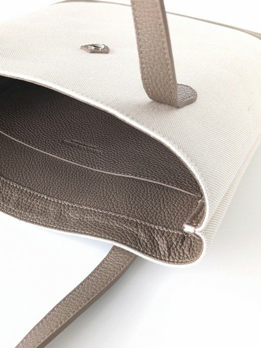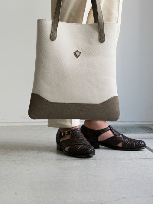 太番手糸を密に織りあげたキャンバスと、上質なシュリンクレザーを使用したトートバッグ。マチなしでスタイリッシュなデザインが魅力的です。丁度良いサイズ感で、ウォレットやスマートフォンなど身の回りの小物が収まり、使い勝手も抜群。デザイン性を高めるエンブレムが、高級感や上品さを感じさせます。