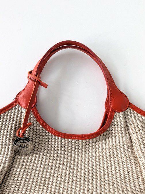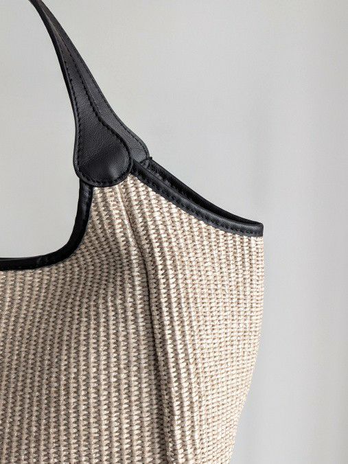 春夏らしい印象のカゴバッグ。カットソーやブラウスなど、アウターなしのスタイリングであれば肩掛けも可能なハンドルサイズです。