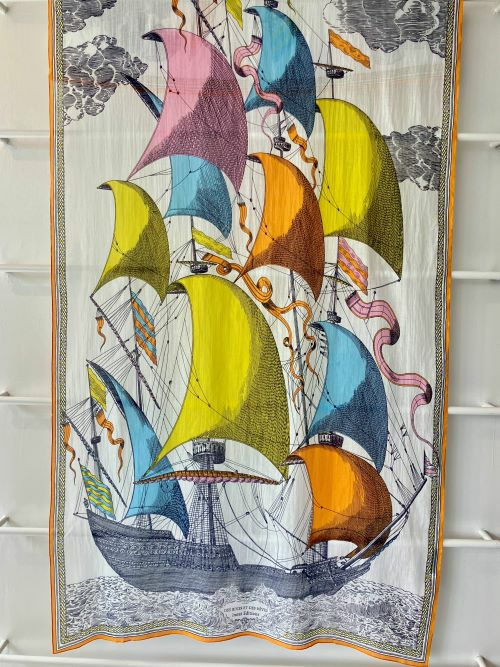 クラシカルな帆船が繊細に描かれたエレガントなスカーフ。鮮やかな配色と縁の上品な装飾が洗練された印象を与え、どんなスタイルやシーンにもマッチします。軽やかでソフトな素材はアレンジ自在で、タイムレスなデザインが装いにユニークなアクセントを添えてくれます。