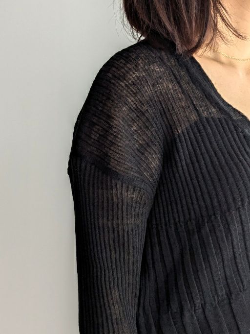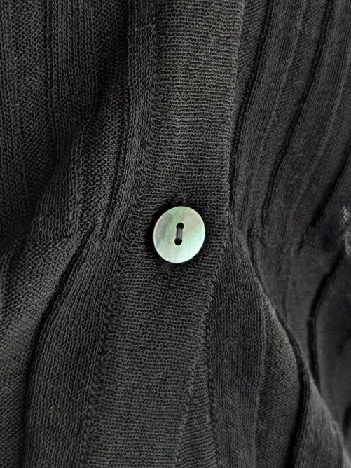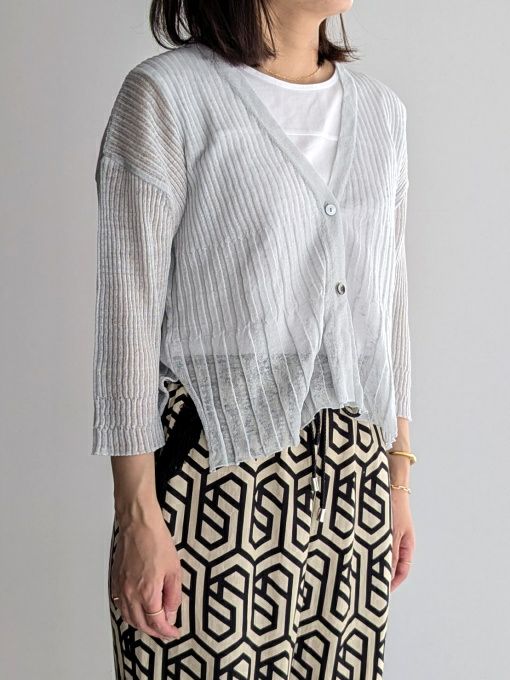 透け感のあるVネックのリブニットカーディガン。着丈が少しショートでサイドのスリットも女性らしさを演出してくれます。リネンの細い糸番手を使用し光沢と柔らかな透け感が初夏から夏の上品な羽織におすすめです。