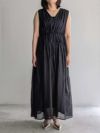 コットンとラミーをブレンドした素材を使用したワンピース。2段階のドローコードによるシルエットの調整が可能で、全体にギャザーが広がり、動きのある表情を楽しめます。カラーはブラックながら、ほんのりとした透け感があり、軽やかで柔らかな印象に仕上がっています。