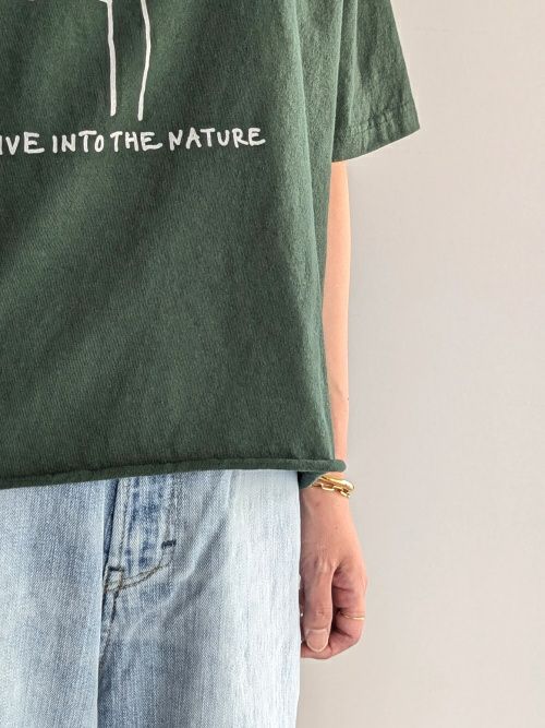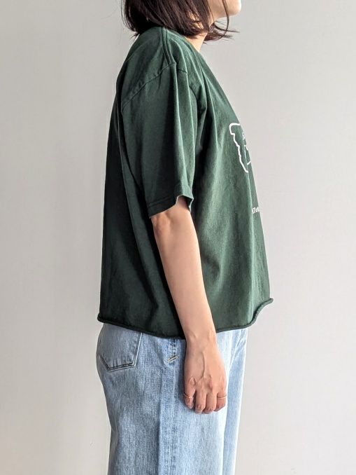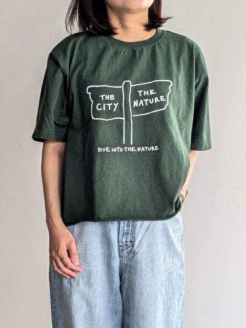 裾のカットオフデザインが特徴的で、こなれた抜け感を演出。メッセージの込められたプリントもキャッチーで、お出掛けするのが楽しくなる一着です。