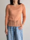 透け感のあるリブニットプルオーバー。着丈が少しショートでサイドのスリットも女性らしさを演出してくれます。リネンの細い糸番手を使用し光沢と柔らかな透け感が初夏から夏の上品な存在感ある一枚です。