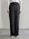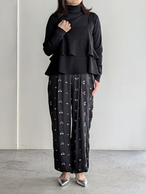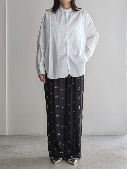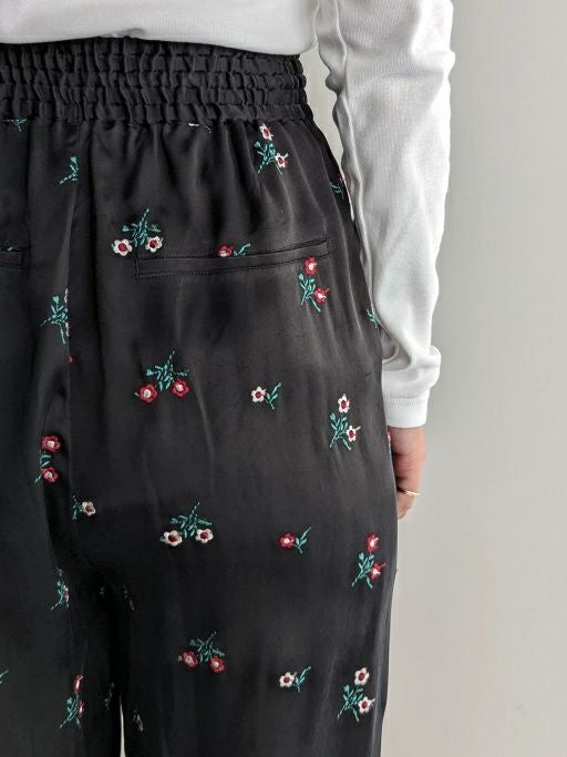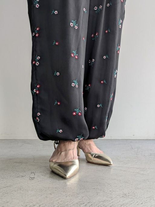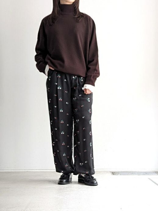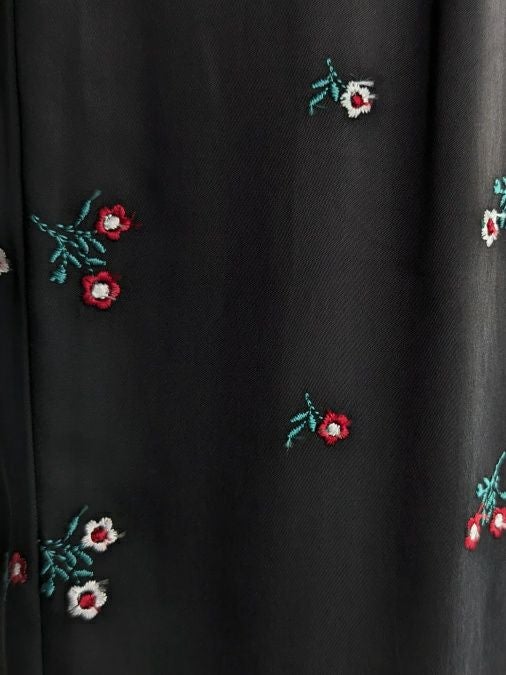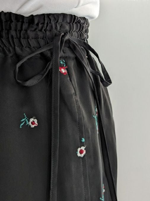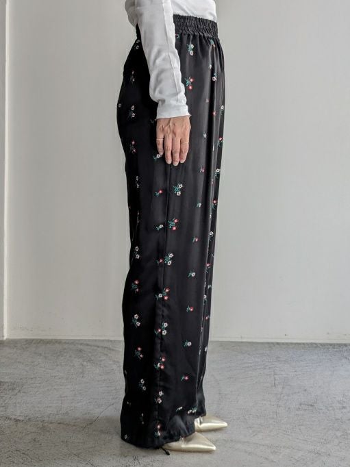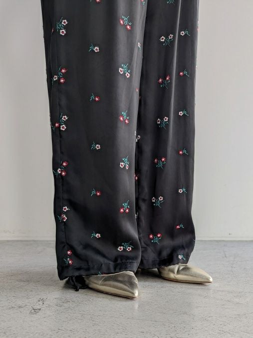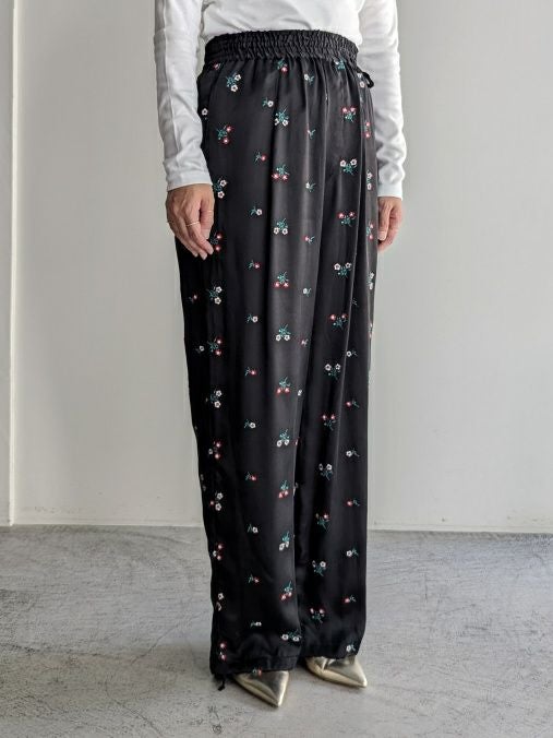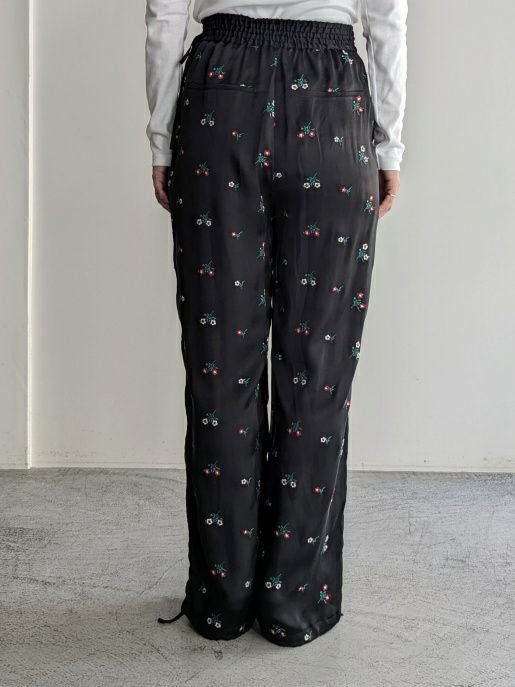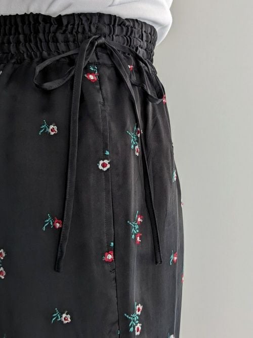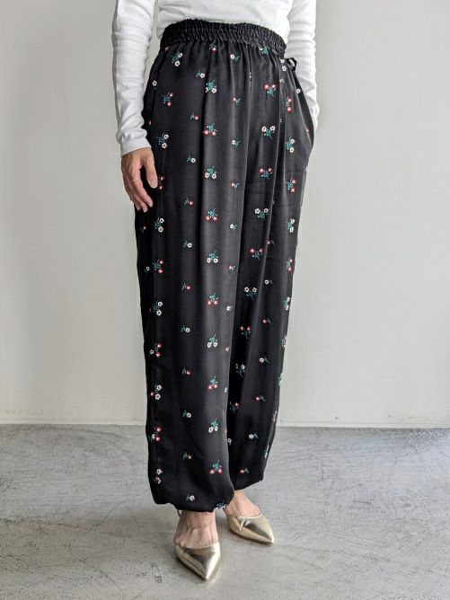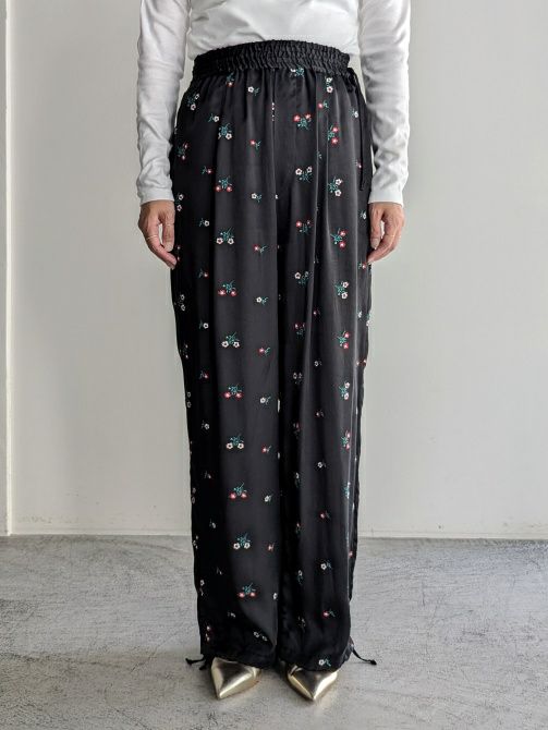 素材はフィブリル化させたキュプラ100%のサテンです。シルキータッチで柔らかくドレープ感に富み、マットな光沢による程よいカジュアル感と品の良さのバランスが絶妙です。散りばめられた可愛らしいフラワー総刺繍は、どこか懐かしく且つ新しく、キャッチーでいてホッとするような心癒される魅力のある生地です。